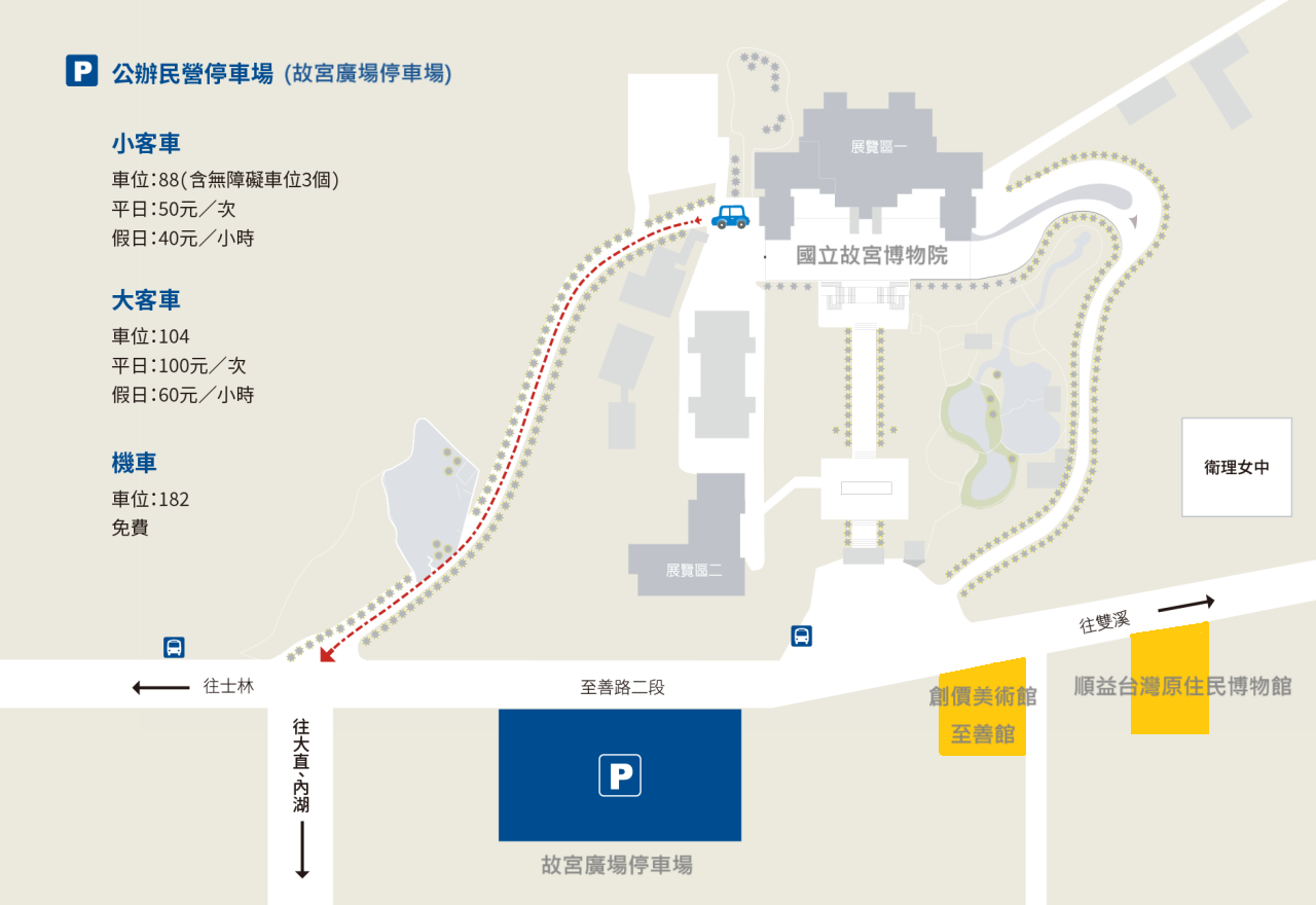 故宮廣場停車場:至善路二段(故宮博物院斜對面,至善天下旁)