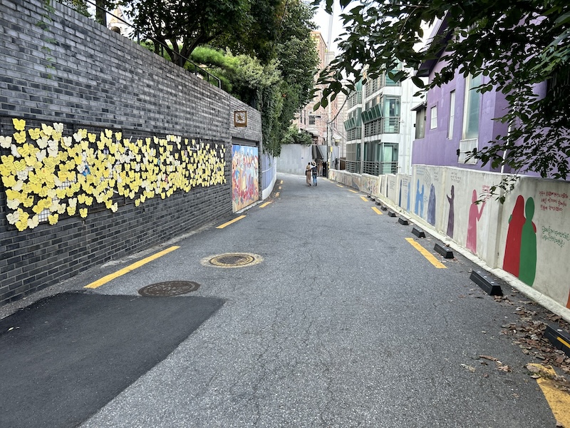遠離囂嚷的市中心,距首爾弘大地鐵站約20分鐘腳程,棲身在住宅區的「戰爭與女性人權館」選址隱蔽。沿著坡道上行,兩旁矮牆上一幅幅女性主題的壁畫夾道相迎,繽紛的色彩洗刷了旅人的躊躇,也層層疊遞了造訪的興致。