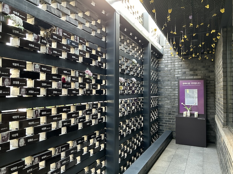 沿著階梯通往明亮的二樓,階梯旁的磚牆上鑲嵌著Halmoni的愁容,並以韓、日、英三種語言雕刻她們對加害者的控訴。隨著觀眾向上行進,日光灑落於牆面,石磚上的文字也轉為祈願的語句,照片中的面孔也逐漸展露笑顏。