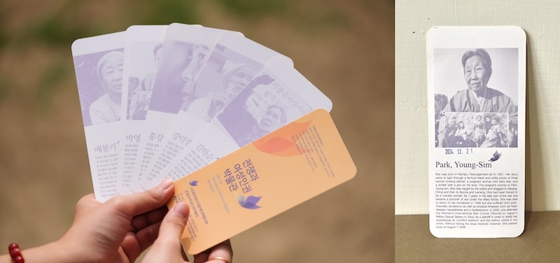 進入館內,便可從門票發現別出心裁的巧思,門票分別紀錄著六位Halmoni的生平故事與照片;另一面繪製的「蝴蝶」則是Halmoni的化身,與踏入展場前的影像作品相呼應,在投影中,受困於磚頭中的蝴蝶經過掙扎,成群結隊一同衝出枷鎖,揭示了展覽的核心意涵: