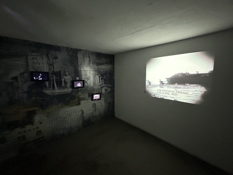 沿著狹廊走到地下一樓的展間,映入眼簾的是伸手不見五指的暗房。牆上的螢幕與投影成為唯一光源。隨著影片中的Halmoni現身說法,揭露真相的「光芒」便會照亮牆面,使印製於牆上的慰安所和紀律表等證據逐一浮現。