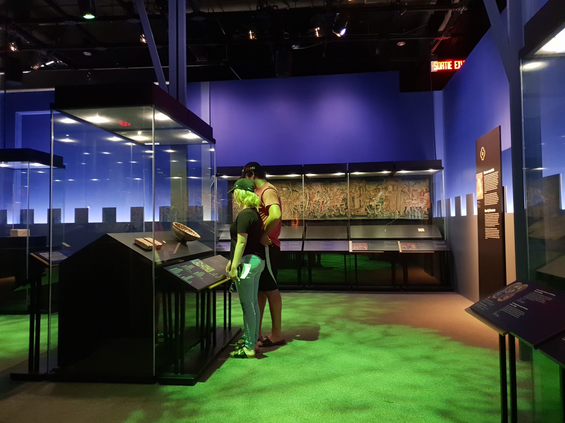 中世紀向來給人黑暗世紀之印象,導致大眾忽略其對現代歐洲與當代社會的影響力。而本展示開宗明義就點出雖然中世紀早期缺乏文字紀錄,但保留了許多精緻的文物與雕刻,展現了相當的財富與品味。其次,展覽應用色彩鮮明與多變的燈光,給觀眾帶來不同的視覺享受,直接顛覆觀眾對中世紀的黑暗想像。例如,宮廷生活展區以藍色與綠色的光影交織,說明中世紀的騎士精神與宮廷愛情的禮儀 (下圖)。而皇家權力區應用環形劇場 360度影像聲光變化,讓觀眾沉浸在中世紀不同年代與場景氛圍中,包括自然的晨昏風景、教堂的興建、聖女貞德的英姿等 (首圖);展區中心則設有電腦互動裝置,觀眾可以點選不同國家與年代的歷史人物,了解其生平經歷與故事。最後,展覽也說明中世紀留給當代的遺產,包括大學的設立、大憲章的簽署、19世紀歌德建築的復興、朝聖之旅以及家徽紋章學,其中大學的設立影響全世界,包括臺灣的高教體系,可說是影響深遠。