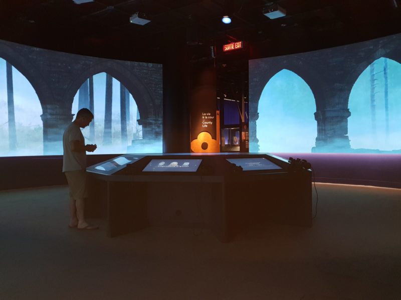 中世紀向來給人黑暗世紀之印象,導致大眾忽略其對現代歐洲與當代社會的影響力。而本展示開宗明義就點出雖然中世紀早期缺乏文字紀錄,但保留了許多精緻的文物與雕刻,展現了相當的財富與品味。其次,展覽應用色彩鮮明與多變的燈光,給觀眾帶來不同的視覺享受,直接顛覆觀眾對中世紀的黑暗想像。例如,宮廷生活展區以藍色與綠色的光影交織,說明中世紀的騎士精神與宮廷愛情的禮儀 (下圖)。而皇家權力區應用環形劇場 360度影像聲光變化,讓觀眾沉浸在中世紀不同年代與場景氛圍中,包括自然的晨昏風景、教堂的興建、聖女貞德的英姿等 (首圖);展區中心則設有電腦互動裝置,觀眾可以點選不同國家與年代的歷史人物,了解其生平經歷與故事。最後,展覽也說明中世紀留給當代的遺產,包括大學的設立、大憲章的簽署、19世紀歌德建築的復興、朝聖之旅以及家徽紋章學,其中大學的設立影響全世界,包括臺灣的高教體系,可說是影響深遠。