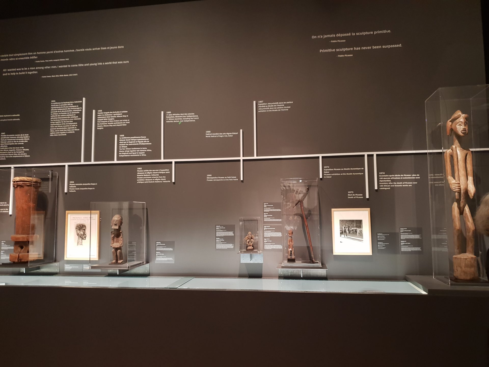 展覽以五個主題展區呈現非洲及畢卡索的藝術,包括〈序曲:啟蒙時代的蒙昧主義〉(Preface: Obscurantism in The Age of Enlightenment) 、〈1878-1915:發明新的觀看〉(1878-1915: The Invention of A New Gaze)、〈1915-1946:從物件到藝術品:藝術領域的拓展〉(1915-1946: From Objects to Artworks: An Extension of the Artistic Terrain)、〈1946到今日:邁向解殖民觀看〉(1946 to Today: Towards the Decolonized Gaze)、〈後記:崩裂的輿圖與世界交易〉 (Postface: Atlas Fractured and The Traffic of Worlds),整個展覽以非洲被殖民及解殖民的歷史為脈絡,將畢卡索的藝術作品與非洲雕塑並排展出,搭配充滿視覺性的立體年表 (圖1),讓觀眾思考畢卡索的創作與非洲藝術的關係。策展人也提出幾個問題,包括:非洲的民族文物如何被視為藝術?我們要如何調解這兩種不同的取徑?