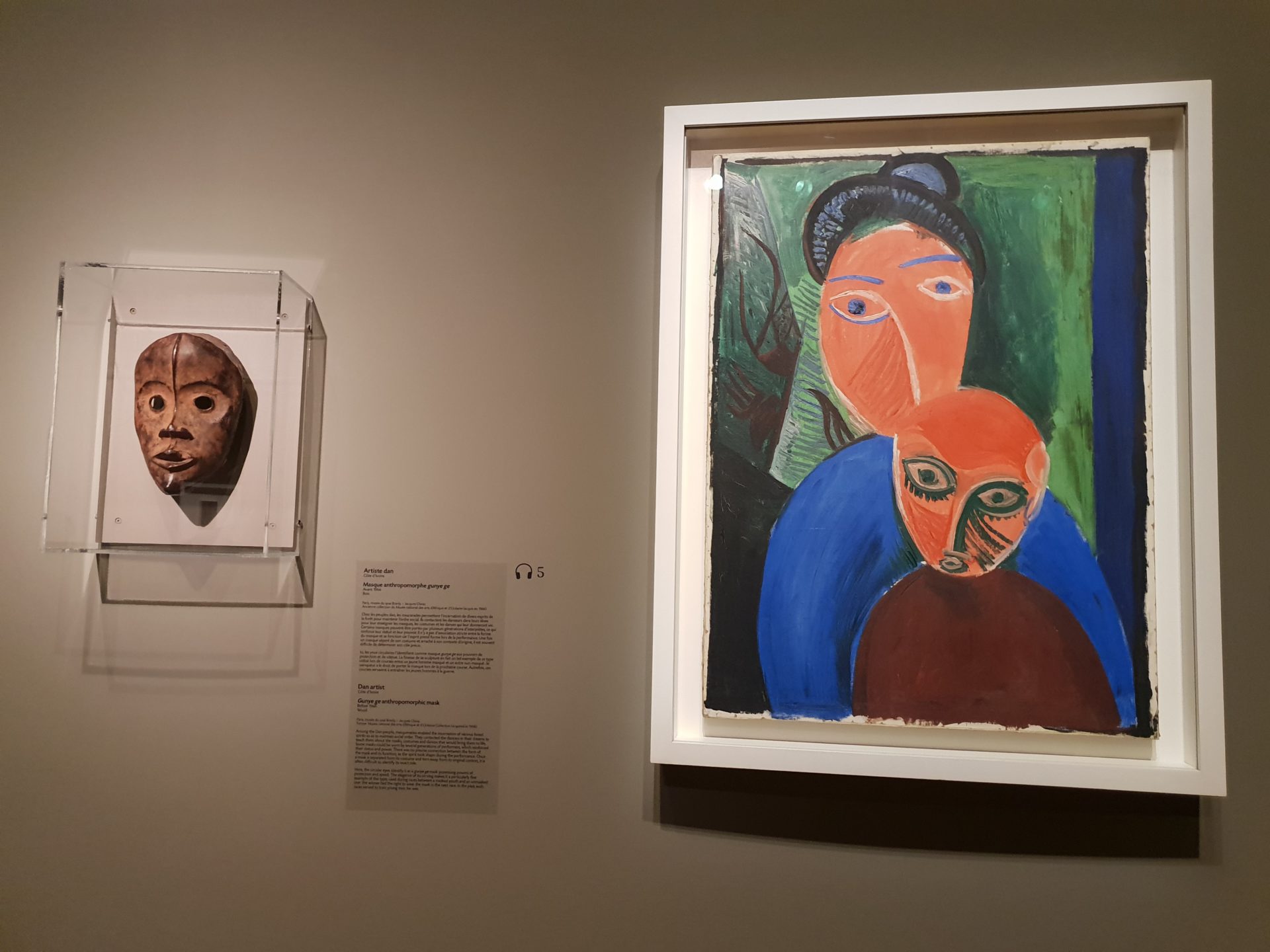 緊接著序曲之後,展覽以畢卡索的年表及創作為主要的敘事結構,但策展人將非洲雕刻與畢卡索的作品並列且平等地展出,讓觀眾可以觀看兩者之間微妙的模仿與轉換關係,並以藝術作品及藝術家稱呼非洲的雕刻家與作品,彰顯美術館將非洲雕刻視為藝術品,而非民族文物的展示策略。舉例而言,並列展出畢卡索〈哭泣的女人〉(Weeping Woman)與因努特藝術家的〈舞蹈面具〉(圖4),及畢卡索〈母親與小孩〉和丹族(Dan) 藝術家的面具 (圖5),每一件作品都搭配作品說明,解說其藝術與文化內涵。