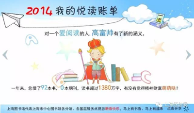 接著一卡通結合數據資源推出「我的悅讀」個人版閱讀帳單服務。該服務不僅展現讀者每年的借閱情況,包括借閱量、借閱偏好、借閱行為等個人化統計和分析,還在動態的頁面中增加了交互內容,讀者可以從中獲得新書推薦、周邊館推薦等個人化體驗。