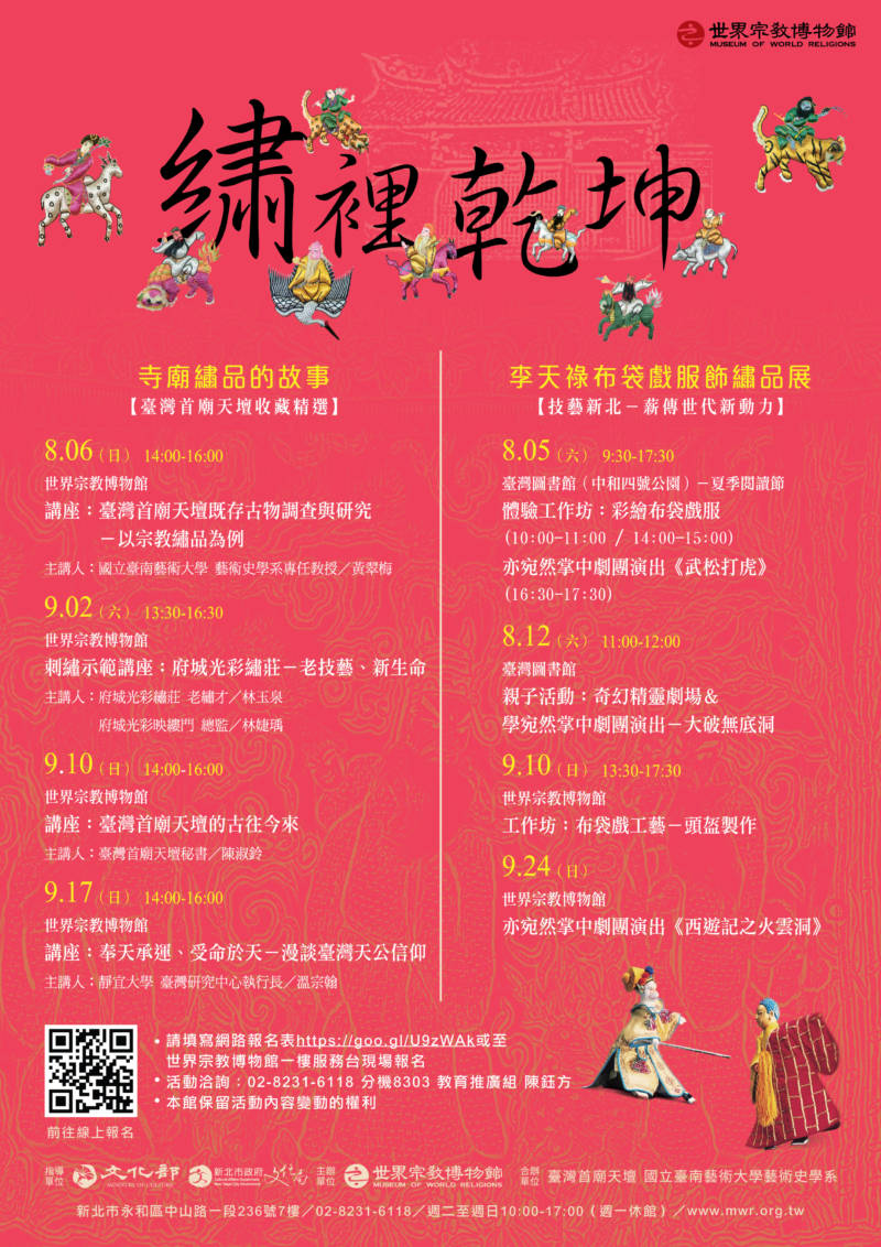 「府城老繡才」林玉泉是國內知名的刺繡工藝師傅,曾獲多項民間工藝刺繡大獎,特展展覽品中也包含林玉泉師傅的作品。除傳統刺繡作品,在新一代的傳承也致力於文創品的開發。本次活動將示範傳統刺繡法、欣賞傳統刺繡之美並分享傳統繡品、現代思維的應用案例。