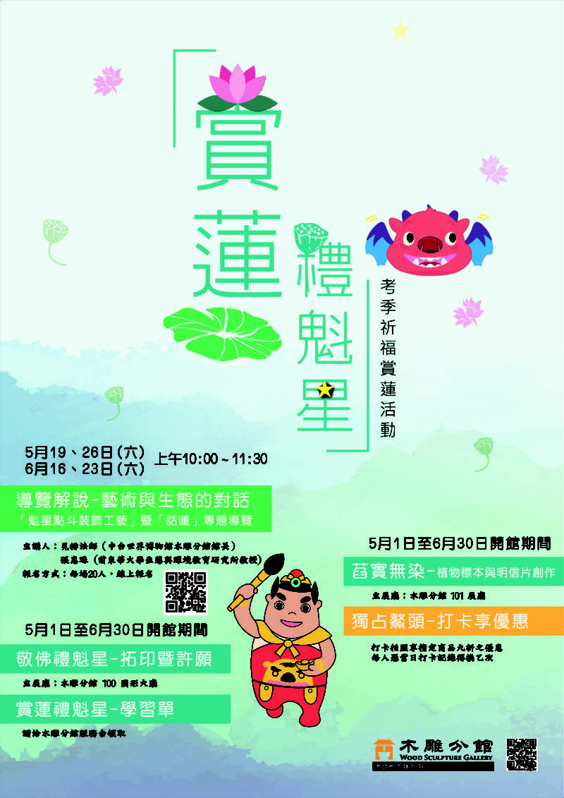 107年五至六月間,中台世界博物館為國內考生、社會大眾帶來精彩的「賞蓮禮魁星」考季活動。您可以在這個活動中,透過木雕分館館長與前東華大學教授的主題導覽、學習單認識木雕分館中「魁星點斗」立像,並且參加分館門前的蓮花池生態專題導覽;讓您能夠從藝術與生態的對話間,認識木雕藝術,體驗自然界中的因緣果成、菩提圓滿。