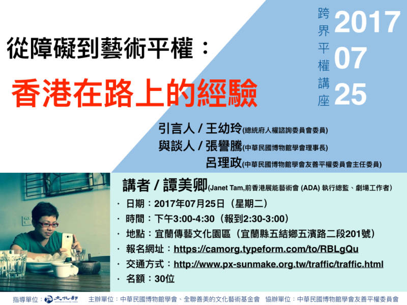 為了更寬廣與多元的分享交流文化平權理念與實務,本次活動特別邀請到前香港展能藝術會 (ADA) 執行總監譚美卿(Janet Tam),以「從障礙到藝術平權:香港「在路上」的經驗」為主題,和各位有興趣的夥伴分享香港經驗,臺灣未必能依循相同的軌跡來發展,但香港的經驗,絕對值得我們參考與借鏡。活動訊息與講師簡介如下,敬邀各位前輩與夥伴們共同參與文化平權跨界交流。