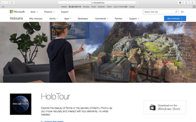 微軟的HoloTour將虛擬現實和增強現實技術融合到一起,不用任何電腦、手機、平板等設備輔助,就能讓你在家裡感受虛擬的建築和風景,我們就像是在一個巨大的360度地圖上走動,想去哪就去哪。在瀏覽到特定景觀時,還會出現相對應建築的介紹,體驗身歷其境的旅行。