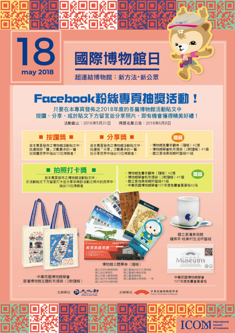 自本粉絲團發佈之2018年博物館活動中,於活動下方留言並打卡、分享參與該活動之照片的粉絲中,抽出10位得獎者!