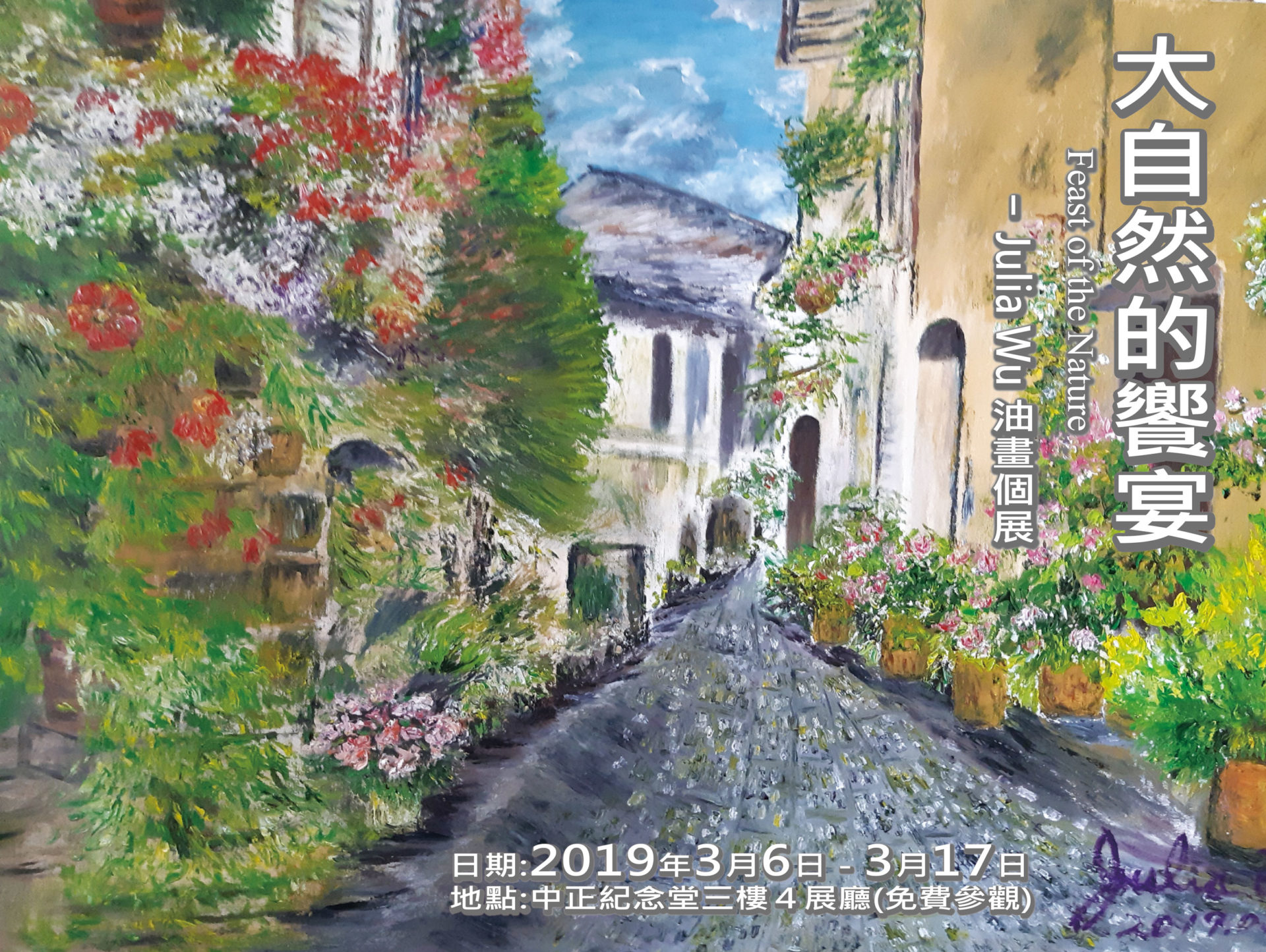 「大自然的饗宴JULIA WU個人油畫展」訂於108年3月6日至108年3月17日在中正紀念堂 4展廳。歡迎參觀!