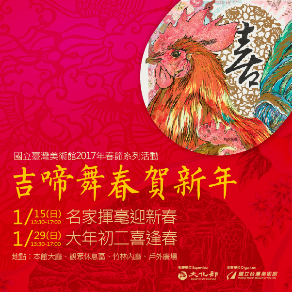 國立臺灣美術館在春節前夕,響應文化部文化平權理念,特別邀請視障書法家廖燦誠現場揮毫表演,落實文化藝術無障礙,並舉辦「名家揮毫迎新春」活動,邀請貴賓與全國美術展書法類得獎者共同開筆,並現場撰寫四字春條供民眾排隊索取。同時,大年初二為配合本館「吉年好運到─雞年年畫特展」,辦理春節節慶活動,將發送民眾紀念品紅包袋,並辦理年曆絹印體驗活動,亦提供木刻活字版畫DIY活動,共同歡慶迎接新春到來!