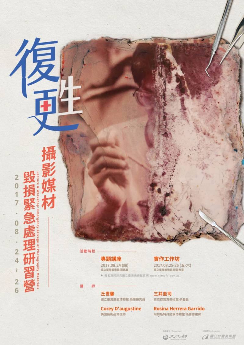 今年的「復甦─攝影媒材毀損緊急處理研習營」專題講座特別邀請國立臺灣歷史博物館助理研究員丘世馨、東京都寫真美術館學藝員三井圭司、阿姆斯特丹國家博物館Rosina Herrera Garrido以及美國當代藝術修復師Corey D’augustine等國內外專家,講述常民生活影像、照片檔案文件及攝影複合媒材作品等不同性質物件的搶救對策與災後處理,同時也將分享文物維護經驗與執行文物救援所制定的規則與策略、執行後的成果跟現況。「工作坊」則藉由觀察攝影複合媒材的作品,探討搶救過程的處理方式與步驟,並將以與作品材質相似的模型模擬修護。同時也將針對一般受水災損壞的照片與底片,進行清潔與乾燥處理教學,並探討災後照片的維護方法。