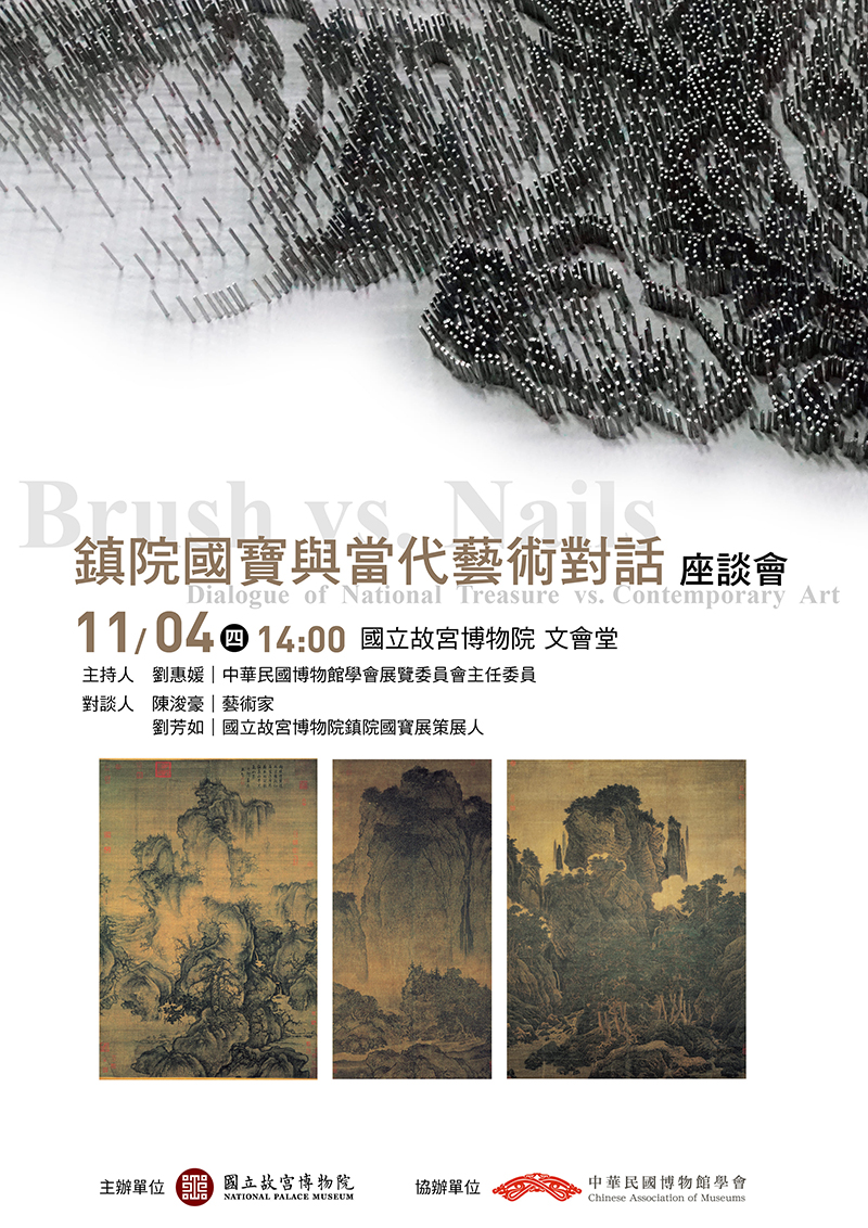 繼「鎮院國寶—范寬、郭熙、李唐」三幅山水巨作之後,歷代畫家透過模仿、再創各種方式,展現後世汲古創新的時代面貌。當代藝術家陳浚豪則是跳脫傳統書畫媒材,運用裝潢材料蚊釘與釘槍,從模擬、仿古到創新,展現水墨皴法,從點、線條到色塊,運用光影產生暈染效果,再現這三件作品:范寬〈谿山行旅圖〉、郭熙〈早春圖〉、李唐〈萬壑松風圖〉。本場座談邀請「鎮院國寶」展策展人與藝術家進行對談,藉由古今作品相互對照,呈現千古名作歷久彌新的影響力,以及由藝術家現身說法,檢視如何從古畫汲取創作泉源,並加入個人獨特詮釋,賦予作品全新的意義。