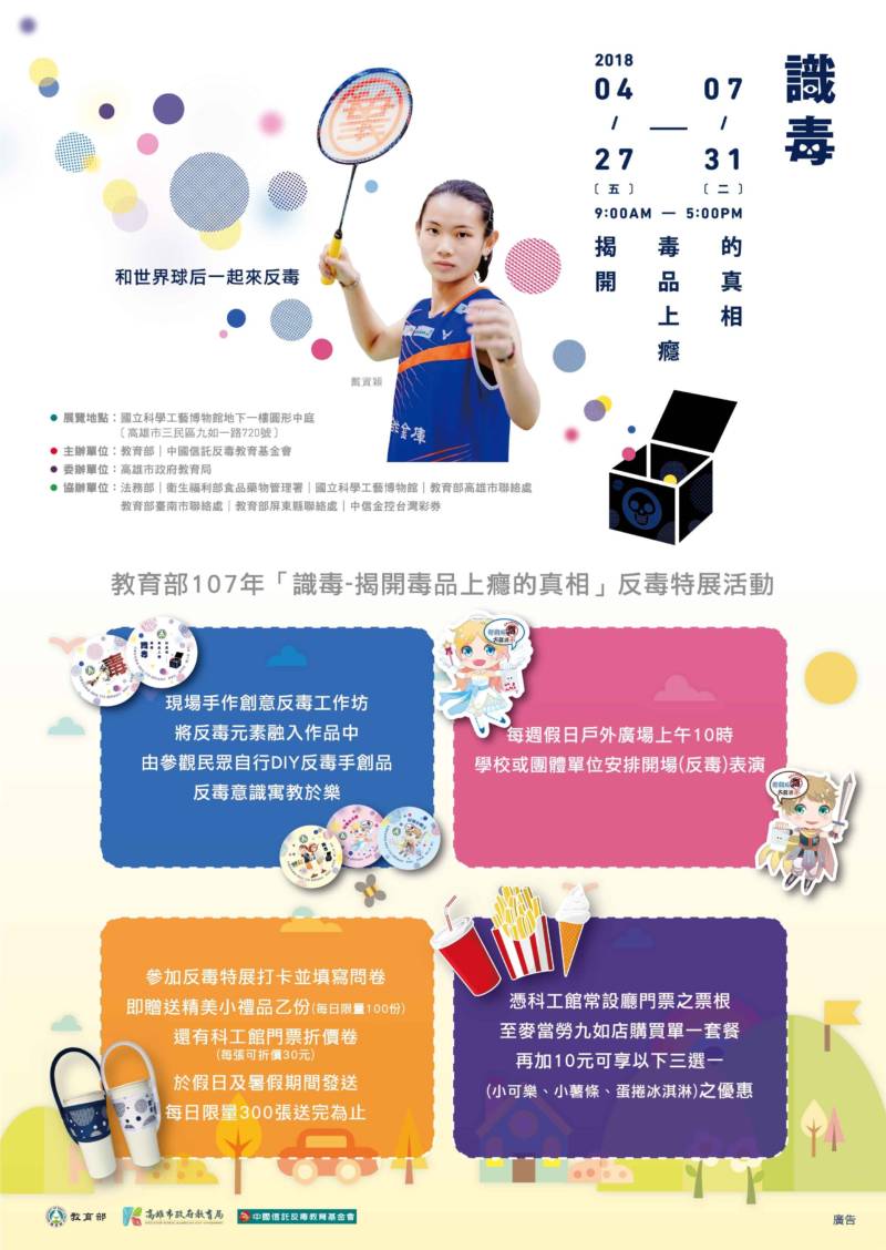 為持續推動防制藥物濫用預防宣導工作,教育部再與中國信託反毒教育基金會合作於107年4月27日至7月31日,於本館辦理「識毒-揭開毒品上癮的真相」反毒特展,期能將民間企業反毒的資源與能量,藉由社教館所的平臺發揚擴散,展覽中透過科技互動、虛擬體驗及提供個案生命歷程等方式,將反毒的教育宣導深植在觀展者心中,不僅建立學生及家長正確的反毒觀念、讓其對於新興毒品有進一步的認識,更讓毒品問題能夠被社會大眾正視並進而獲得解決。