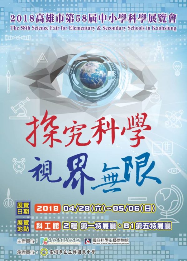 高雄市第58屆中小學科學展覽會自4月28日到5月6日(4月30日休館)對外開放展出,地點在國立科學工藝博物館二樓與地下一樓特展區,由高雄市教育局主辦,正興國中承辦。今年作品主題豐富多樣,充分展現高雄市學子驚人的多元思考,透過在生活中細膩觀察,開展不同風格的作品,激發科學潛能,成果豐碩令人讚嘆,也展現師生從生活中「用心動腦玩科學」。