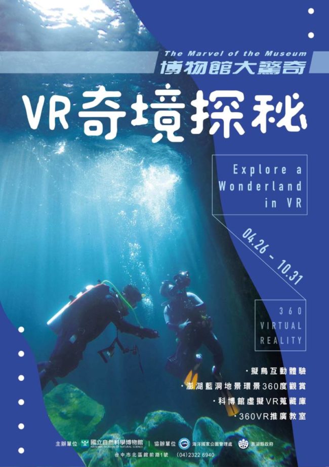 有別於傳統靜態的體驗展覽,結合最新的VR科技與體感技術,主題包含擬鳥互動體驗、澎湖藍洞地景360度觀賞、科博館虛擬VR蒐藏庫與360VR推廣教室等,讓大眾可以身歷其境體驗虛實整合的世界,感受本館來自海陸空不同的館藏,感受博物館的一切都活起來了!
