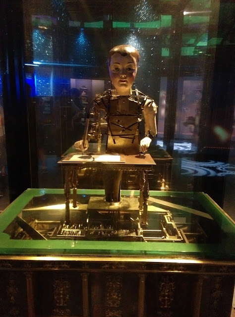 本區展出的物件中,最引人注目的即是這個「自動繪圖員-作家(Automaton Draughtsman-Writer)」,大約在1800年被精心打造出來,該機械能夠存有四幅圖畫以及三首英文與法文詩,透過內部由精密的齒輪所控制,上身則為一個孩童的臉(圖1)與手握著筆進行規律的機械繪製(圖2)。