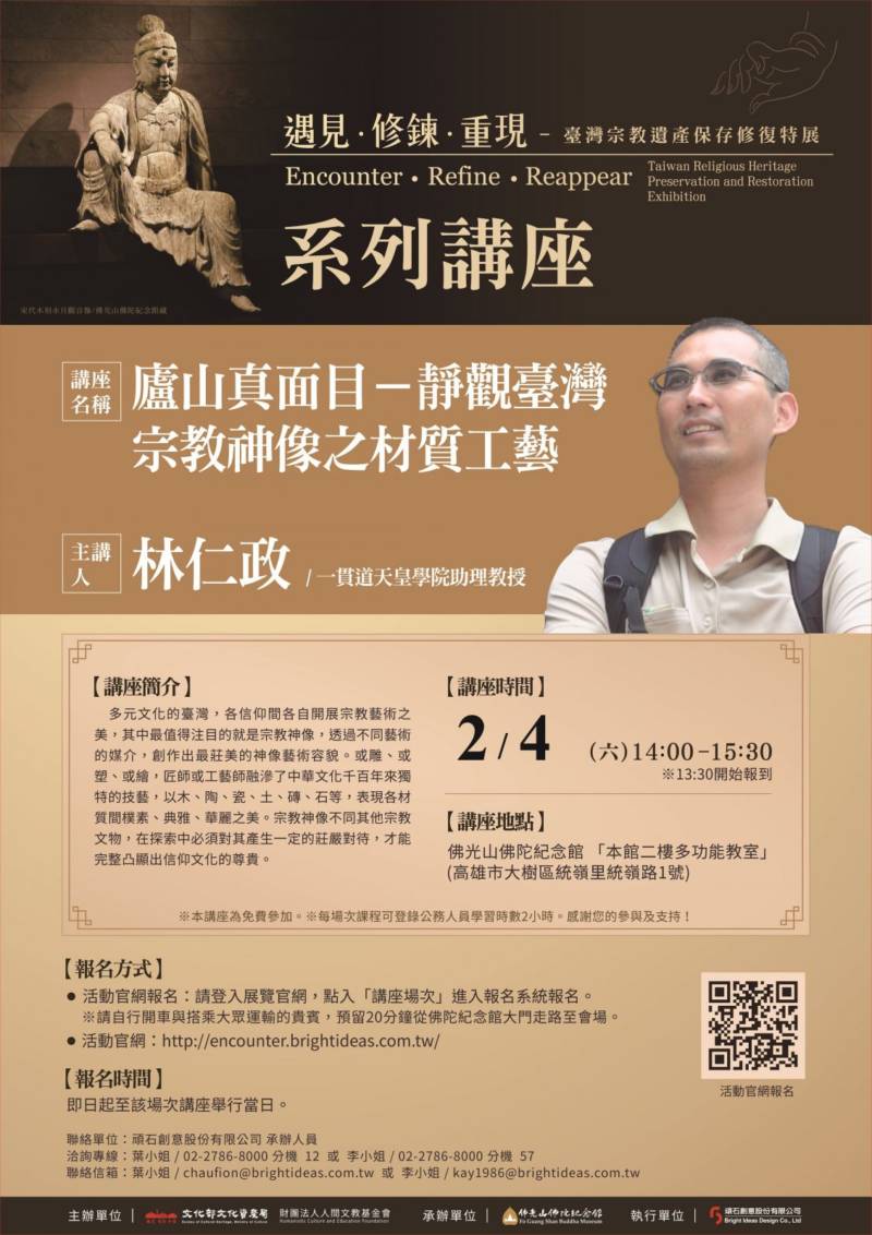 文化部文資局所主辦之「遇見‧修鍊‧重現-臺灣宗教遺產保存修復特展」,配合本次展覽辦理七場系列講座,歡迎想進一步認識台灣豐富而多元宗教遺產的各位踴躍參與。