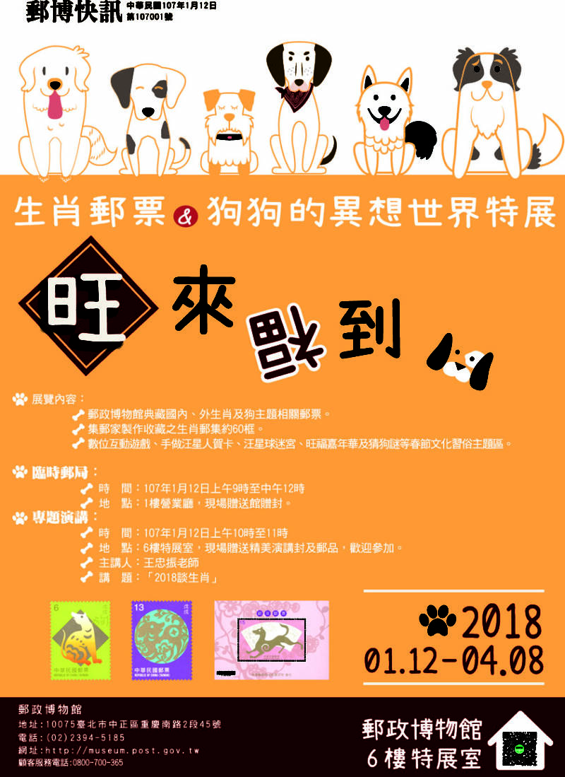 中華郵政公司為迎接農曆生肖狗年來臨,訂於107年1月12日至4月8日在郵政博物館舉辦「旺來福到-生肖郵票&狗狗的異想世界特展」,展出與十二生肖及狗相關之郵票、郵集及可愛狗狗的異想世界,邀請大、小朋友入館探索饒富趣味的汪星人世界,體驗2018狗狗的新年異想夢數位互動遊戲、手做汪星人賀卡、汪星球迷宮、旺福嘉年華及猜狗謎等,搶先感受濃濃傳統年味的歡欣氣氛。展覽期間相關活動如下: