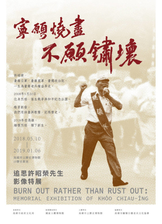 許昭榮先生,臺籍日軍,臺籍國軍,臺獨政治犯,終生為臺籍老兵奔走,在旗津海邊以烈火殉道,化為千風。2018年為許昭榮先生逝世十周年,史博館規劃紀念特展,追思其一生為爭取臺籍老兵權益,藉此更希望能引發民眾對於臺籍老兵議題之認識與重視。