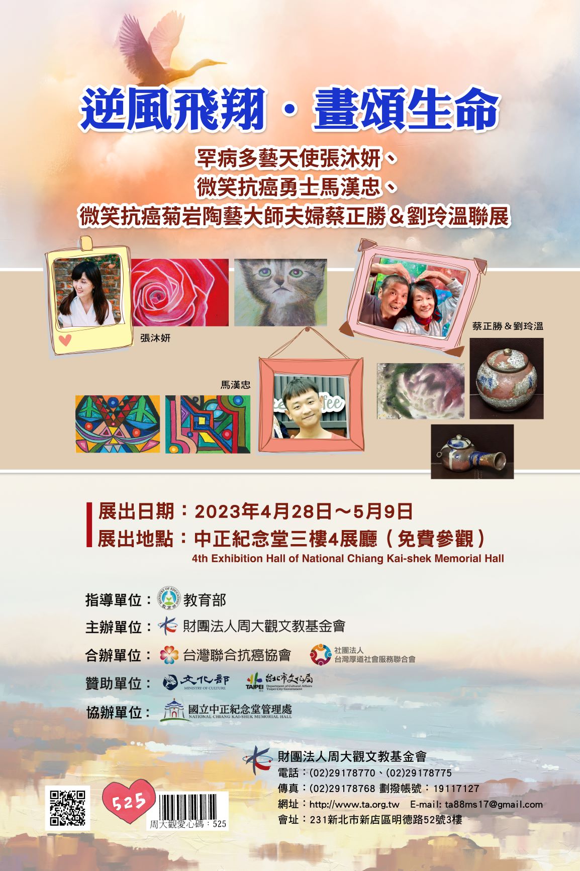 本次聯展的4位藝術家—罕病多藝天使張沐妍、微笑抗癌勇士馬漢忠、微笑抗癌菊岩陶藝大師夫婦蔡正勝&劉玲溫,各自用藝術,開創生命的另一番光景,將生命能量投入藝術作品中,展現生生不息的生命力,讓人人都能成為自己生命中的藝術大師,勇敢揮灑屬於自己的光彩,見證天生我材必有用。