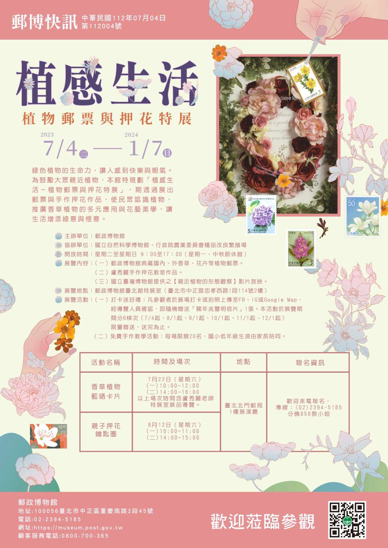 綠色植物的生命力,讓人感到快樂與朝氣。為鼓勵大眾親近植物,本館特規劃「植感生活-植物郵票與押花特展」,期透過展出郵票與手作押花作品,使民眾認識植物,推廣香草植物的多元應用與花藝美學,讓生活增添綠意與愜意。