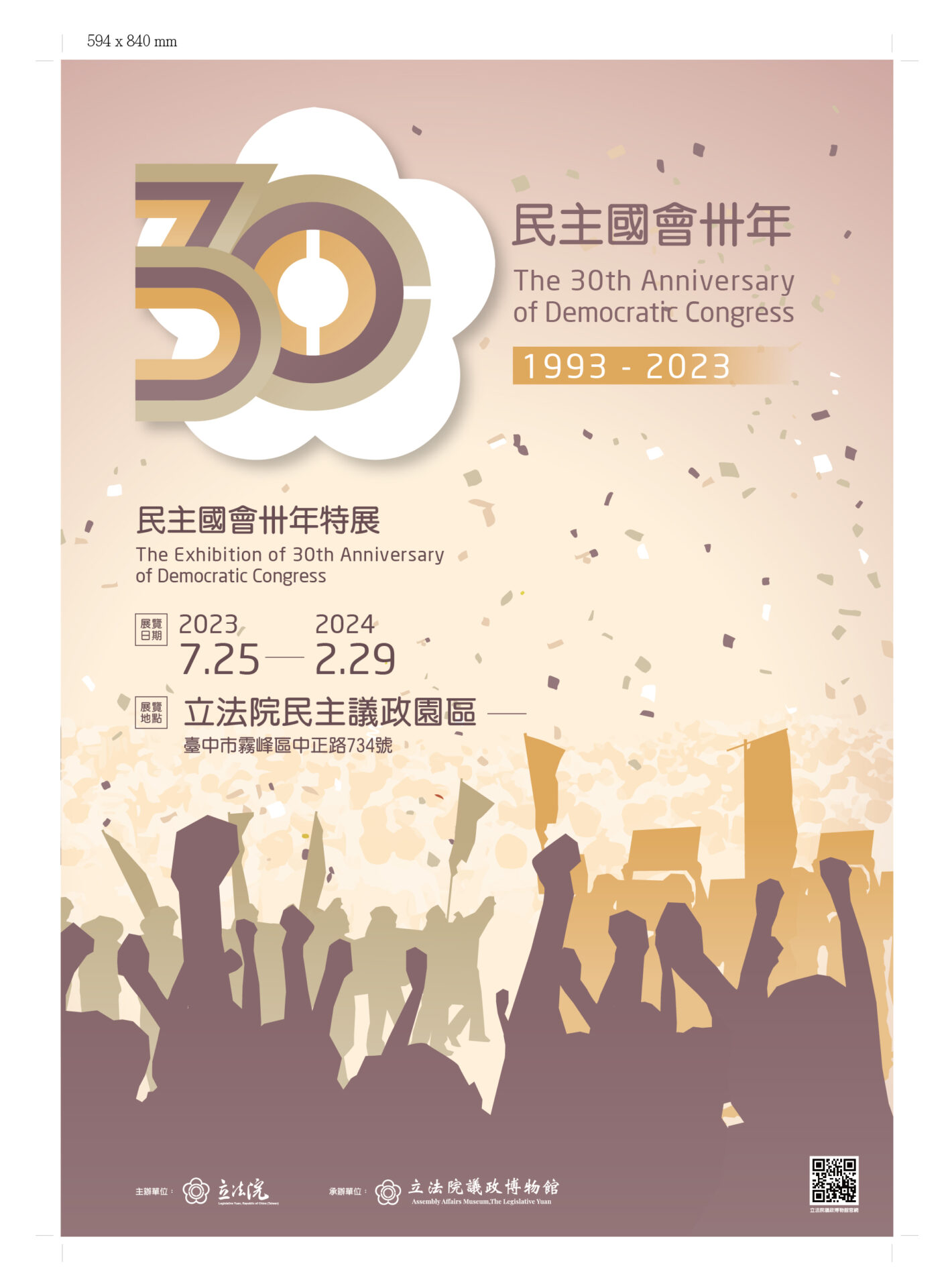 2023年適逢「臺灣議會期成同盟會」成立與「治警事件」屆滿百年以及民主國會30週年,爰立法院議政博物館於立法院民主議政園區朝琴館1樓辦理【臺灣議會期成同盟會成立暨治警事件百年展】及【民主國會卅年特展】聯展,展期自2023年7月25日起至2024年2月29日止,歡迎蒞臨參觀指教。