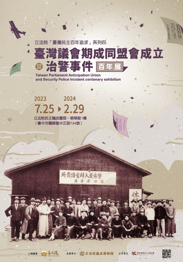 2023年適逢「臺灣議會期成同盟會」成立與「治警事件」屆滿百年以及民主國會30週年,爰立法院議政博物館於立法院民主議政園區朝琴館1樓辦理【臺灣議會期成同盟會成立暨治警事件百年展】及【民主國會卅年特展】聯展,展期自2023年7月25日起至2024年2月29日止,歡迎蒞臨參觀指教。