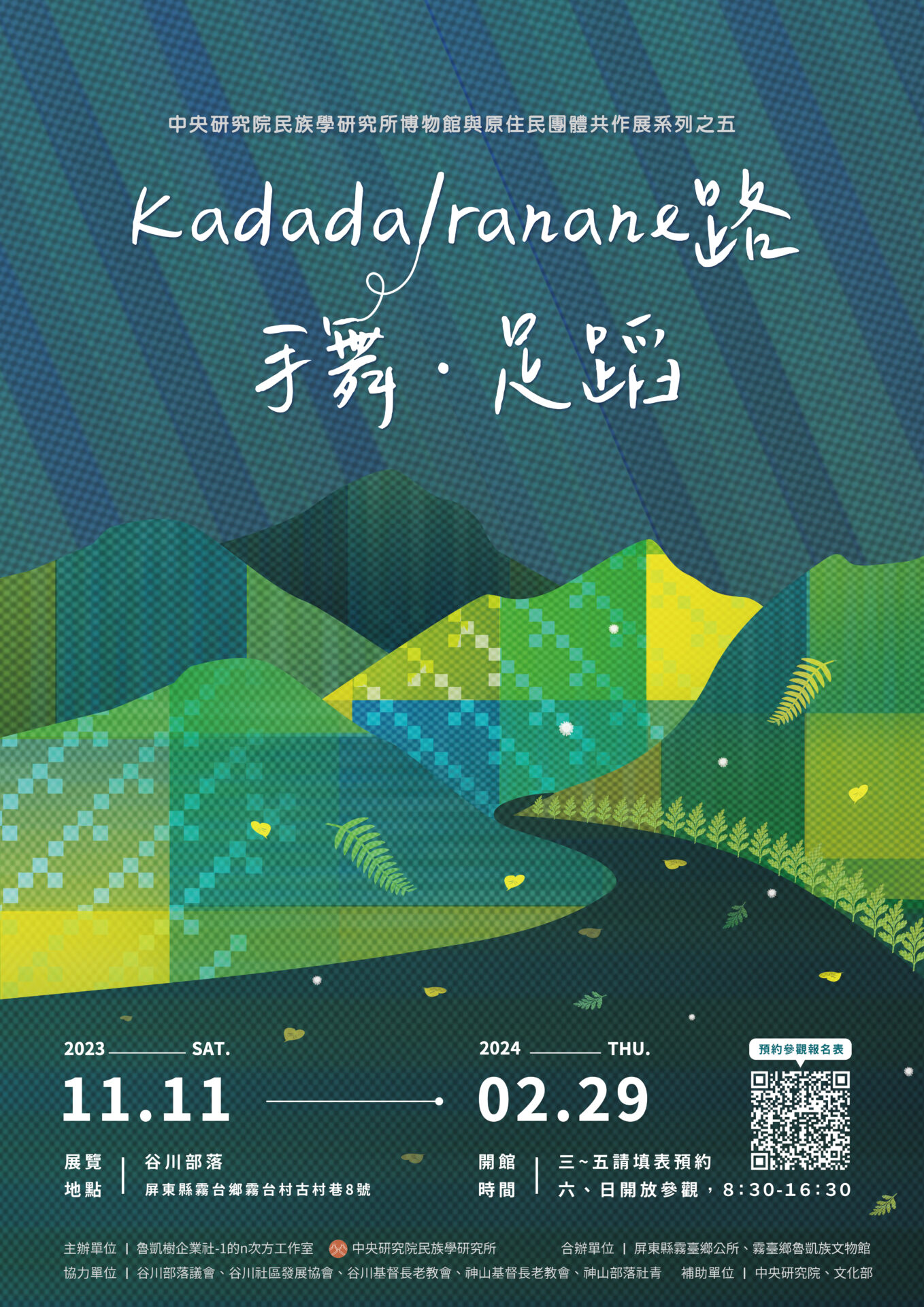 中研院民族所博物館共作展邁入第五屆,本次霧臺共作展「Kadadalranane路.手舞.足蹈」由魯凱樹企業社-1的n次方工作室負責人貝若桑˙甦給那笛米及中研院民族所林文玲研究員共同策展。展覽以貿易之路為主題,透過文物探索魯凱族人在空間與時間中移動的軌跡。魯凱族祖先揹著山中珍寶,赤足自高山部落前往平原城鎮的腳程如「足蹈」;沿途透過手的採集、農耕和編織展現勞動之美如「手舞」。而谷川部落作為魯凱與排灣文化共生之地,自古為西魯凱北隘寮群往來平原城鎮必經聚落,現為跨越谷川大橋進入霧臺鄉之門戶。沿著這條路徑,人與事和物、人之意念與想像,在移動、交流、連結和轉向中,交織出不同群體的生活故事。