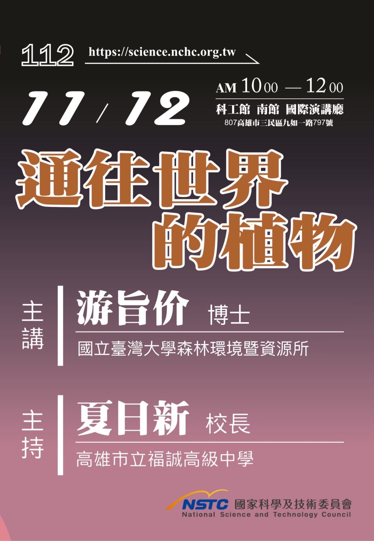 臺灣高山是生物多樣性的方舟、植物交匯之所,一處神奇之地。透過生物地理學的生態與歷史之眼,以臺灣高山植物為主角,打開臺灣和世界的連結,由國科會連續補助第21屆的週日閱讀科學大師講座,於112年11月12日上午10時邀請國立臺灣大學森林環境暨資源所游旨价博士,主講「通往世界的植物」,經歷一場場臺灣高山植物通往全世界的百萬年盛大冒險之旅。