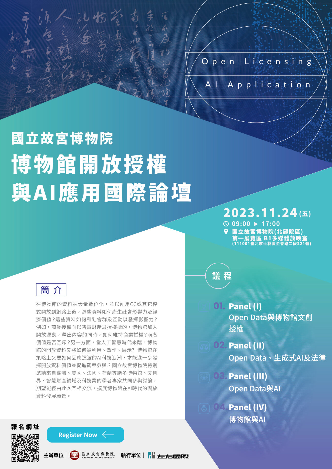 此次故宮邀請來自臺、美、法、荷等諸多博物館、文創界、智慧財產領域、數位及科技業的學者專家共同參與討論,期望透過多元交流,擴展博物館在AI時代的開放資料發展願景。
