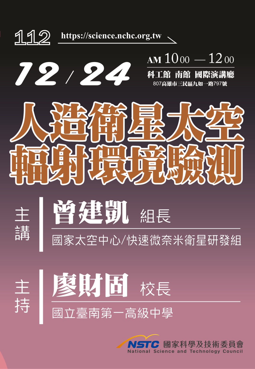 在外太空中環境中,充滿了各式各樣的粒子,其中包含了質子、中子、電子、光子與重粒子等。對於人造衛星而言,當高能粒子碰撞到衛星元件時,有時會發生訊號異常的現象,或是發生永久性失效的問題,導致人造衛星無法正常工作而提早結束任務。由國科會連續補助第21屆的週日閱讀科學大師講座,於112年12月24日上午10時邀請國家太空中心微奈米衛星研發組曾建凱組長,主講「人造衛星太空輻射環境驗測」,讓我們一同探索星際。