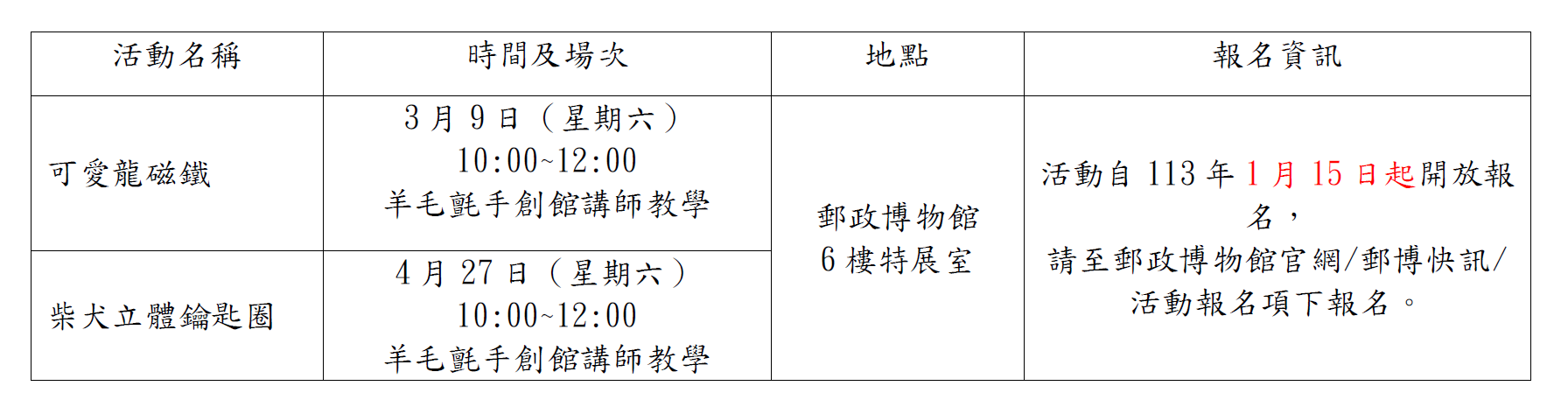 連絡人及電話:郵政博物館 02-23945185
