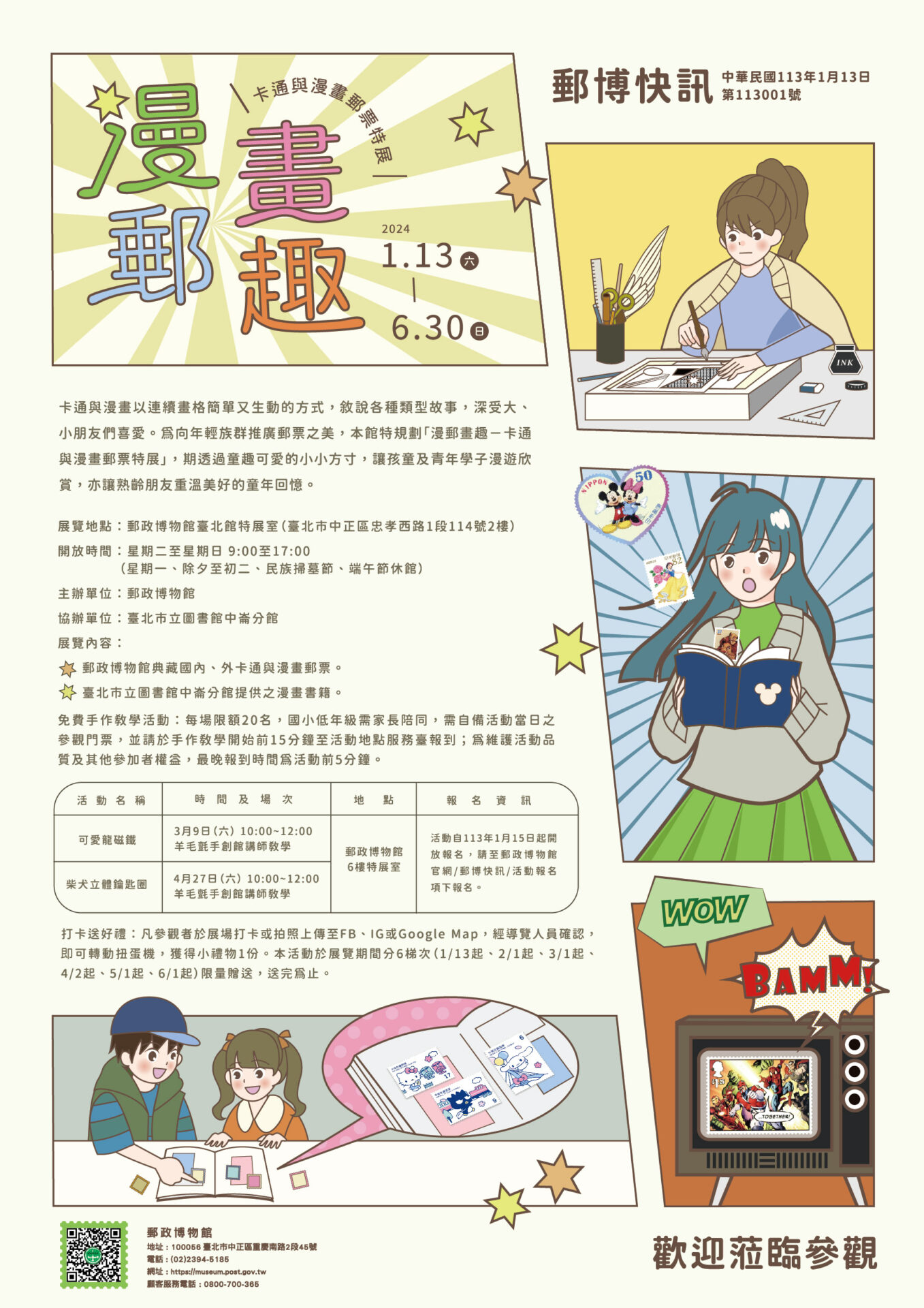 卡通與漫畫以連續畫格簡單又生動的方式,敘說各種類型故事,深受大、小朋友們喜愛。為向年輕族群推廣郵票之美,本館特規劃「漫郵畫趣-卡通與漫畫郵票特展」,期透過童趣可愛的小小方寸,讓孩童及青年學子漫遊欣賞,亦讓熟齡朋友重溫美好的童年回憶。