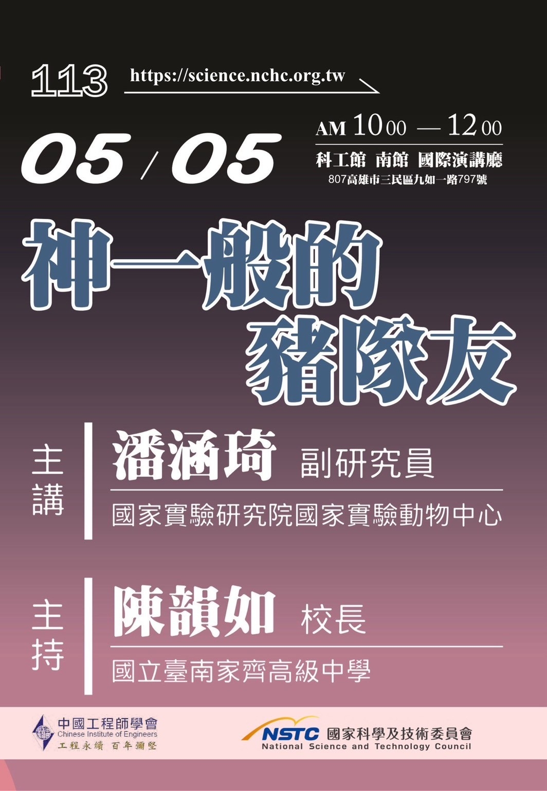 「豬隊友」常常被用來形容在工作上遇到很糟糕的同事,還會連帶影響整個團隊的運作,但其實真實的「豬」隊友可是一點都不雷,牠們不但外表圓滾可愛、內在溫馴聰明,在生醫研究上的貢獻更是像神一般的存在,功不可沒。由國科會連續補助第21屆的週日閱讀科學大師講座,於113年5月5日上午10時邀請國家實驗研究院國家實驗動物中心潘涵琦副研究員,主講「神一般的豬隊友」,讓我們一同認識這群可愛、聰明的豬隊友吧!