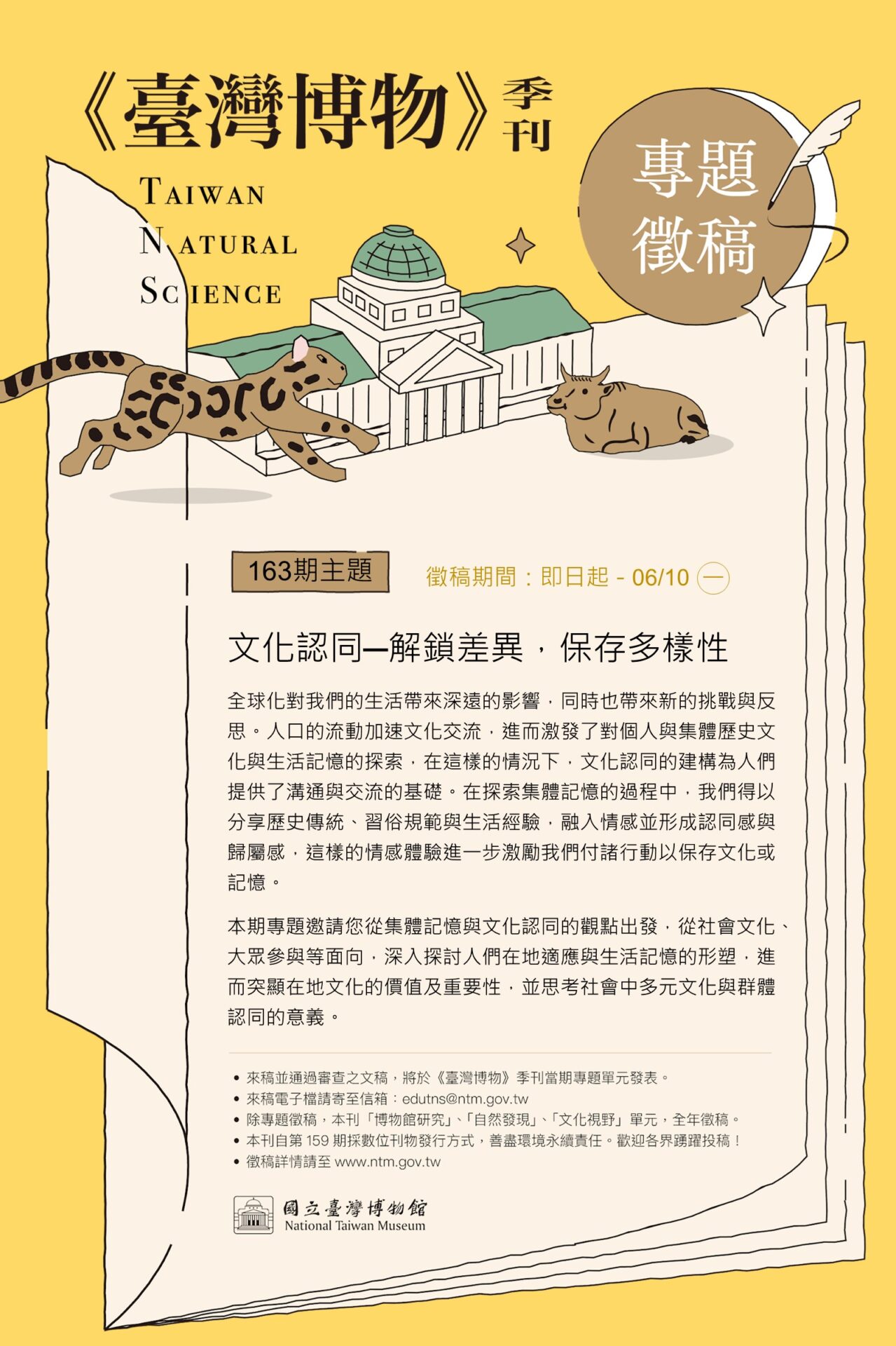 《臺灣博物》季刊自1982年創刊,為臺博館出版的科普刊物,以推廣人文、自然及博物館知識為旨。第163期專題以「文化認同-解鎖差異,保存多樣性」為題徵稿,截稿日期為113年6月10日,歡迎各界踴躍投稿!