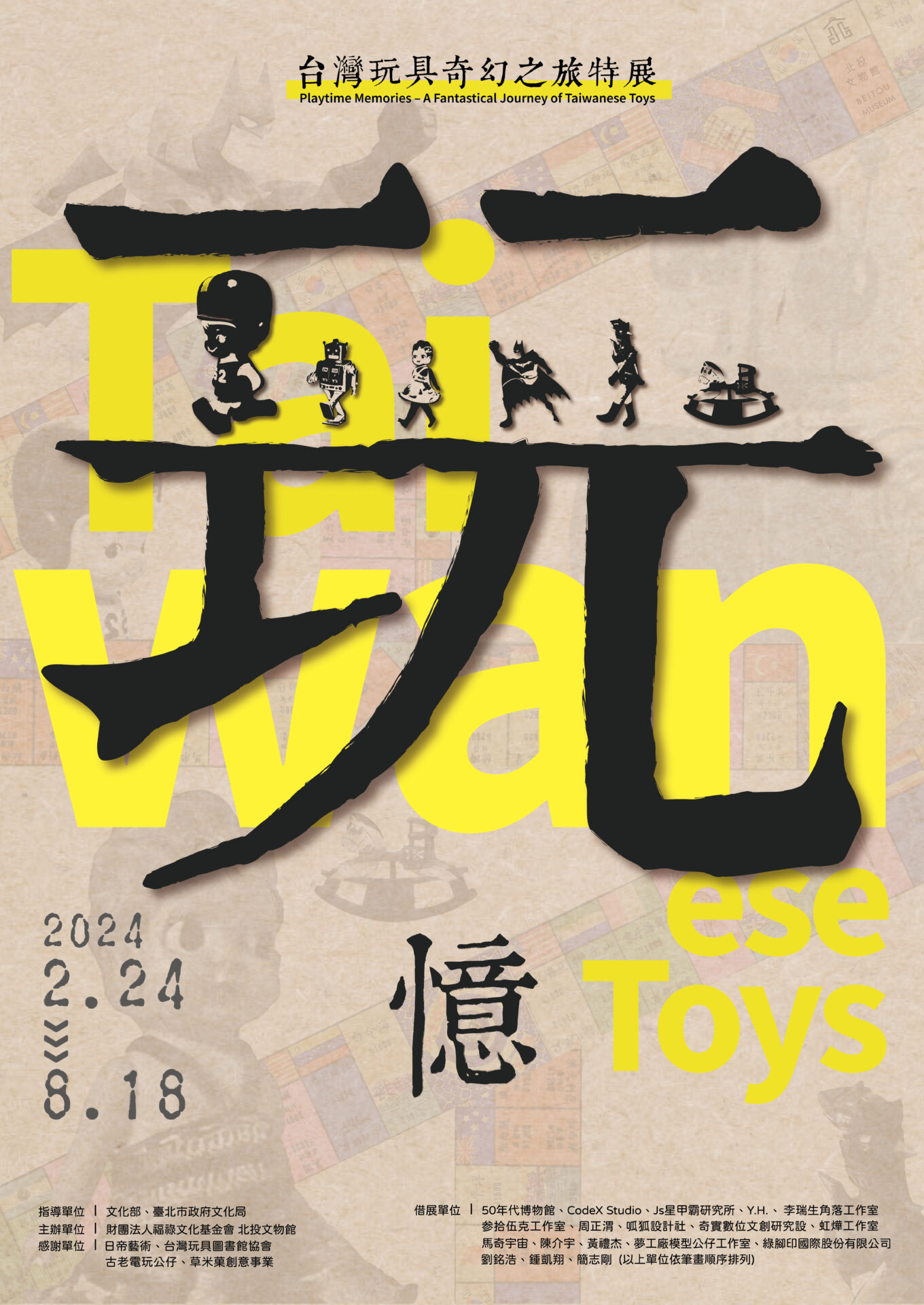 本次展覽設計了七個主題,包括「傳統風華—經典玩具的懷舊足跡」、「創意獨具—主題性玩具的繽紛奇境」、「智慧樂園—益智玩具的策略世界」、「科技樂章—電動玩具的遊樂饗宴」、「夢幻創造—設計師玩具的奇幻天地」、「永續樂遊—環保再生玩具的綠意未來」以及「歲月情懷—台灣玩具的浮光掠影」,每個主題都演繹了不同世代的成長足跡與當時玩具產業的創造力。讓我們一起走進台灣玩具的奇幻之旅,尋找那個屬於自己的玩具記憶!
