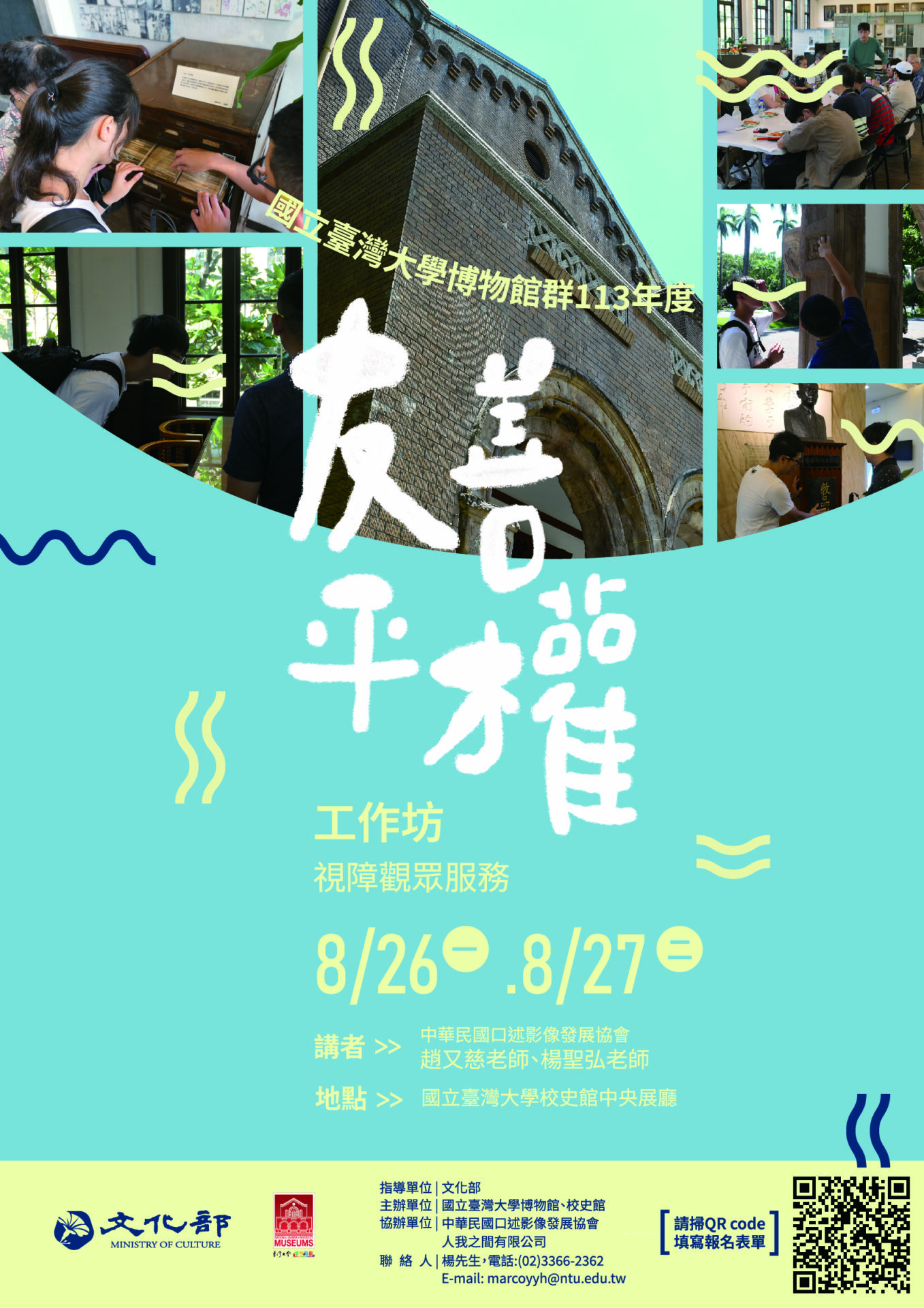 今年度臺大博物館群於文化部支持下,舉辦友善平權「視障觀眾服務」工作坊,邀請有興趣的博物館從業人員共同參與。
