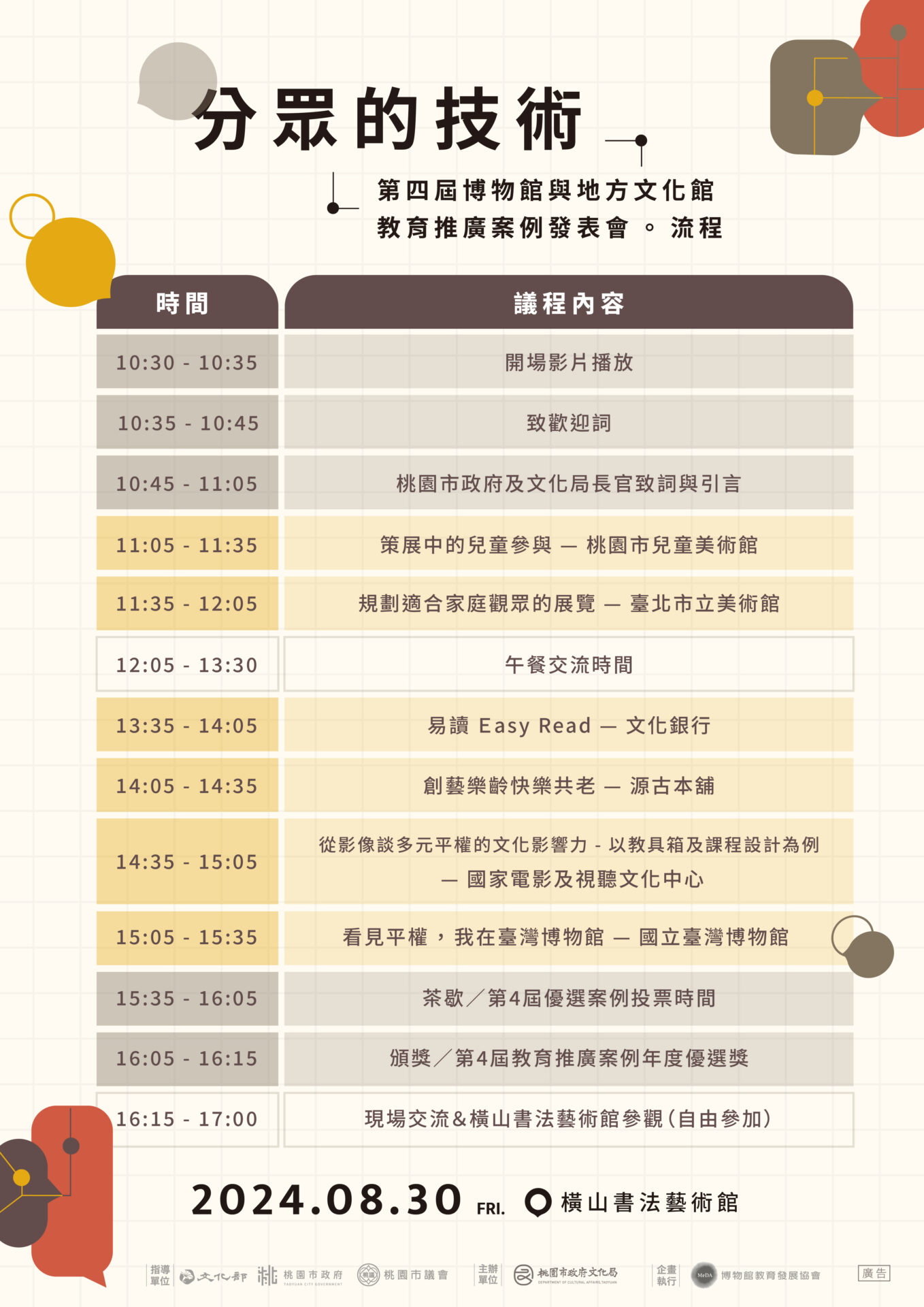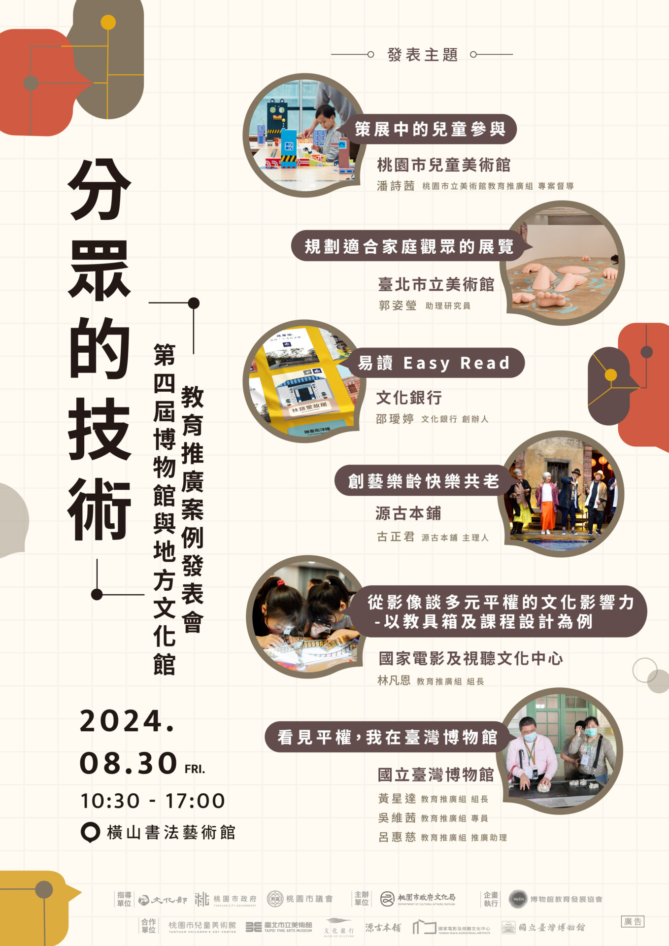 第4屆「博物館與地方文化館教育推廣案例發表會:分眾的技術」,將邀請各館所帶來豐富多元的案例,分享如何通過分眾技術,設計出符合各類觀眾需求的內容:包涵兒童、高齡者、智青、視障者、教師等群體,提供更細緻化的觀眾體驗,開展出多樣化且包容的博物館進程