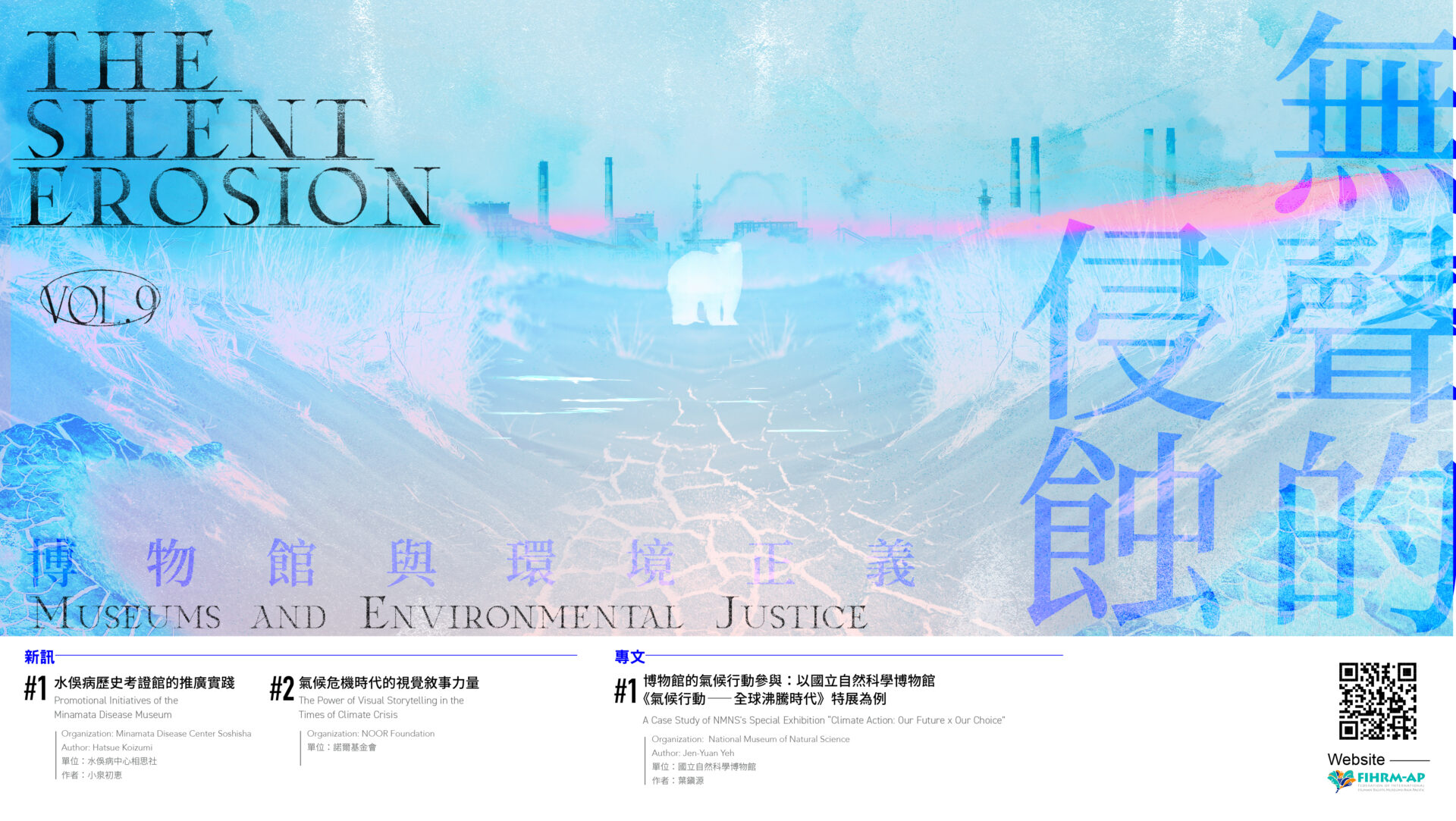 本期以「無聲的侵蝕:博物館與環境正義」為主題,探討博物館與資料館如何發揮教育及推廣優勢,提升大眾對於環境汙染及氣候變遷的意識,促進反思與對話,並激發積極行動的可能性。此外,在氣候變遷的議題上,視覺敘事展現出影像強大的號召力與情感力量,有效喚起外界對當地氣候危機的關注。