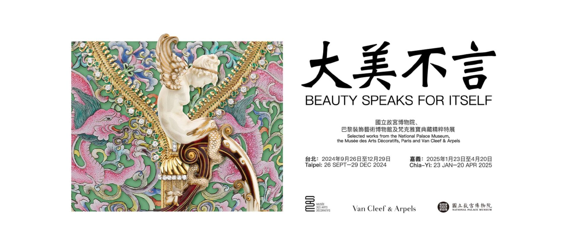 「大美不言」特展匯聚多元藝術形式,是國立故宮博物院、巴黎裝飾藝術博物館和 Van Cleef & Arpels 梵克雅寶珠寶世家三方深度交流後的結晶,透過沉浸式「舞台場景(tableaux)」型態,呈現260餘件瑰麗作品。本次展覽分別於2024年9月26日至12月29日在台北故宮博物院,以及2025年1月23日至4月20日在嘉義故宮博物院兩地舉行。
