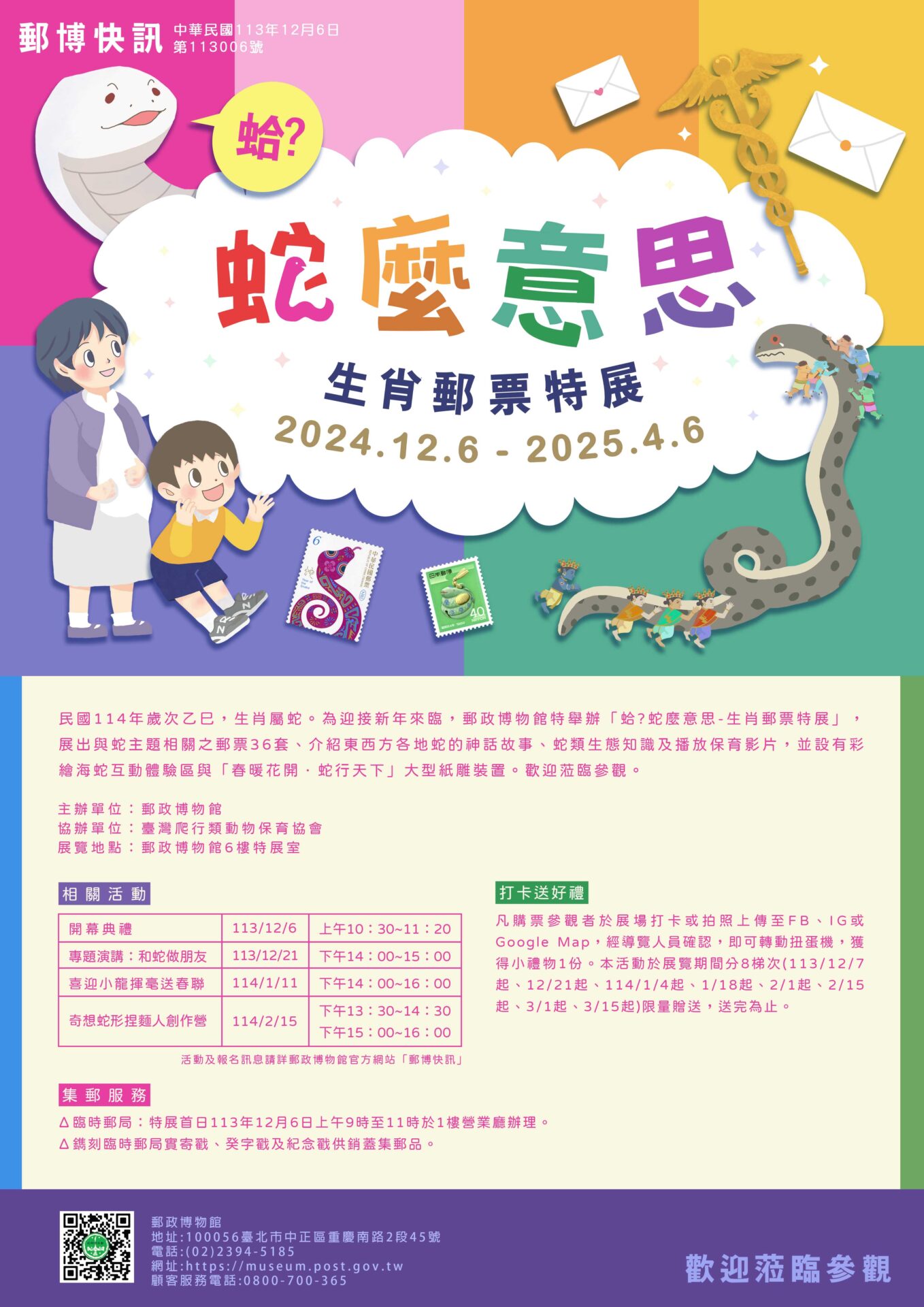 民國114年歲次乙巳,生肖屬蛇。為迎接新年來臨,郵政博物館特舉辦「蛤?蛇麼意思-生肖郵票特展」,展出與蛇主題相關之郵票36套、介紹在東、西方各地蛇的神話故事、蛇類生態知識及播放保育影片,並設有彩繪海蛇互動體驗區與「春暖花開.蛇行天下」大型紙雕裝置。歡迎蒞臨參觀。