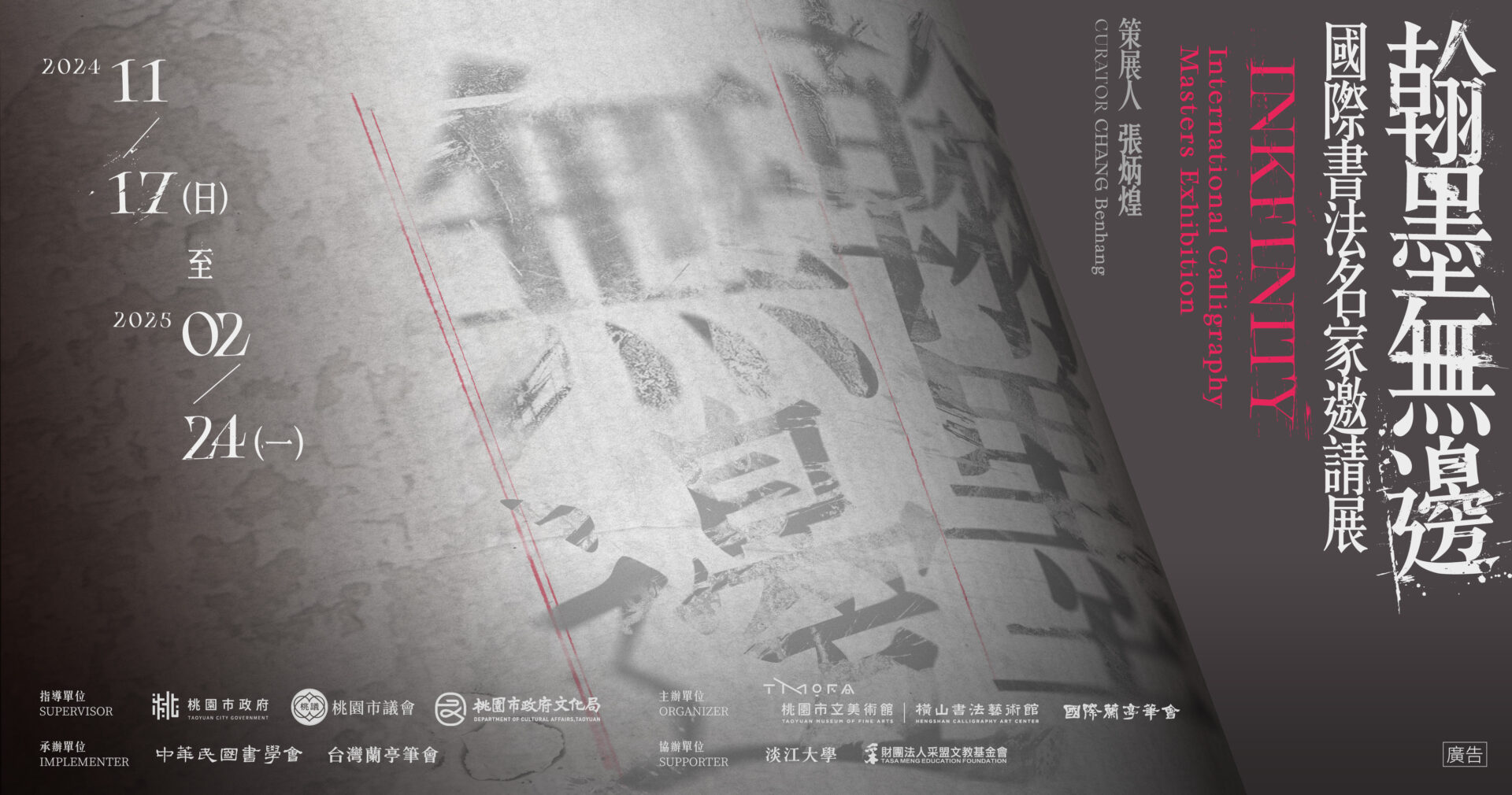 本展「翰墨無邊—國際書法名家邀請展」,於2024年11月17日起至2025年2月24日隆重展出。本次集結來自中國、日本、韓國、臺灣,以及馬來西亞、新加坡、印尼、越南、阿根廷9地的書法名家,共展出59組件書法作品,呈現當代書法藝術的多元面貌與發展脈絡。