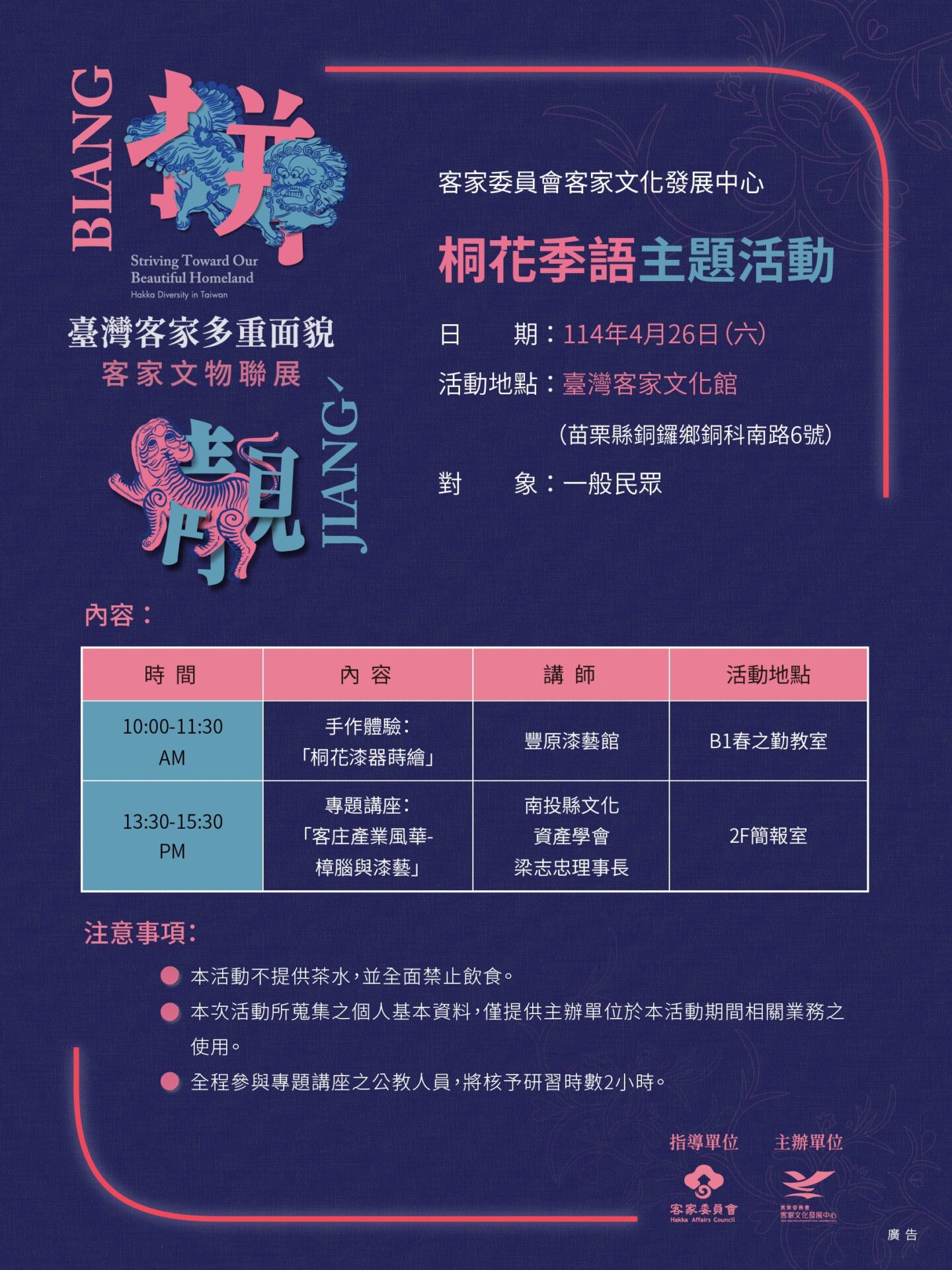 本次活動延伸展示單元「變」區內容,樟腦與漆藝曾為客庄重要經濟產業,透過手作體驗讓大家製作專屬桐花漆盤;與專題講座介紹樟腦如何稱霸世界以及生漆如何發展出臺灣蓬萊塗的故事,歡迎報名!