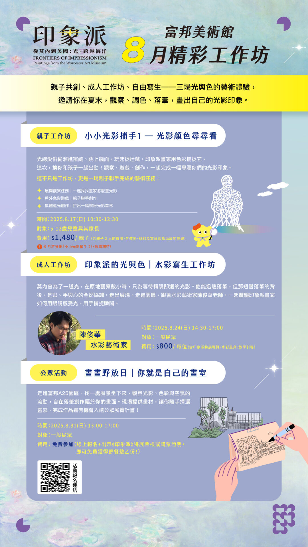 備註:活動免費參加。網路預約報名,現場憑《印象派—從莫內到美國:光・跨越海洋》特展票根、QR Code或相關購票證明可兌換野餐墊乙份並可優先借用畫具!