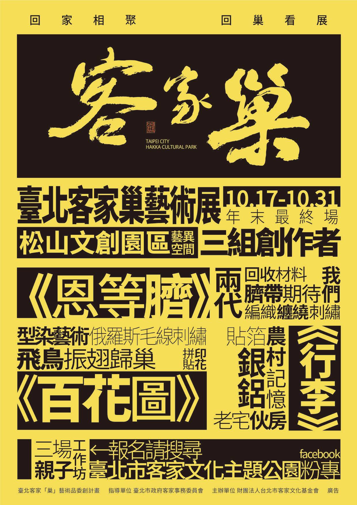 臺北客家巢藝術在松菸!本次展覽徵求的3組青年藝術創作者「楊芳宜與賴桂春」、「黃至正」、「陳育霖」,皆以「竇」(譯:鳥巢)為主題扣連藝術作品,分別運用廢棄素材編織、型染藝術、俄羅斯毛線刺繡、鋁箔等媒材,企圖形塑新一代都會客家的樣貌…