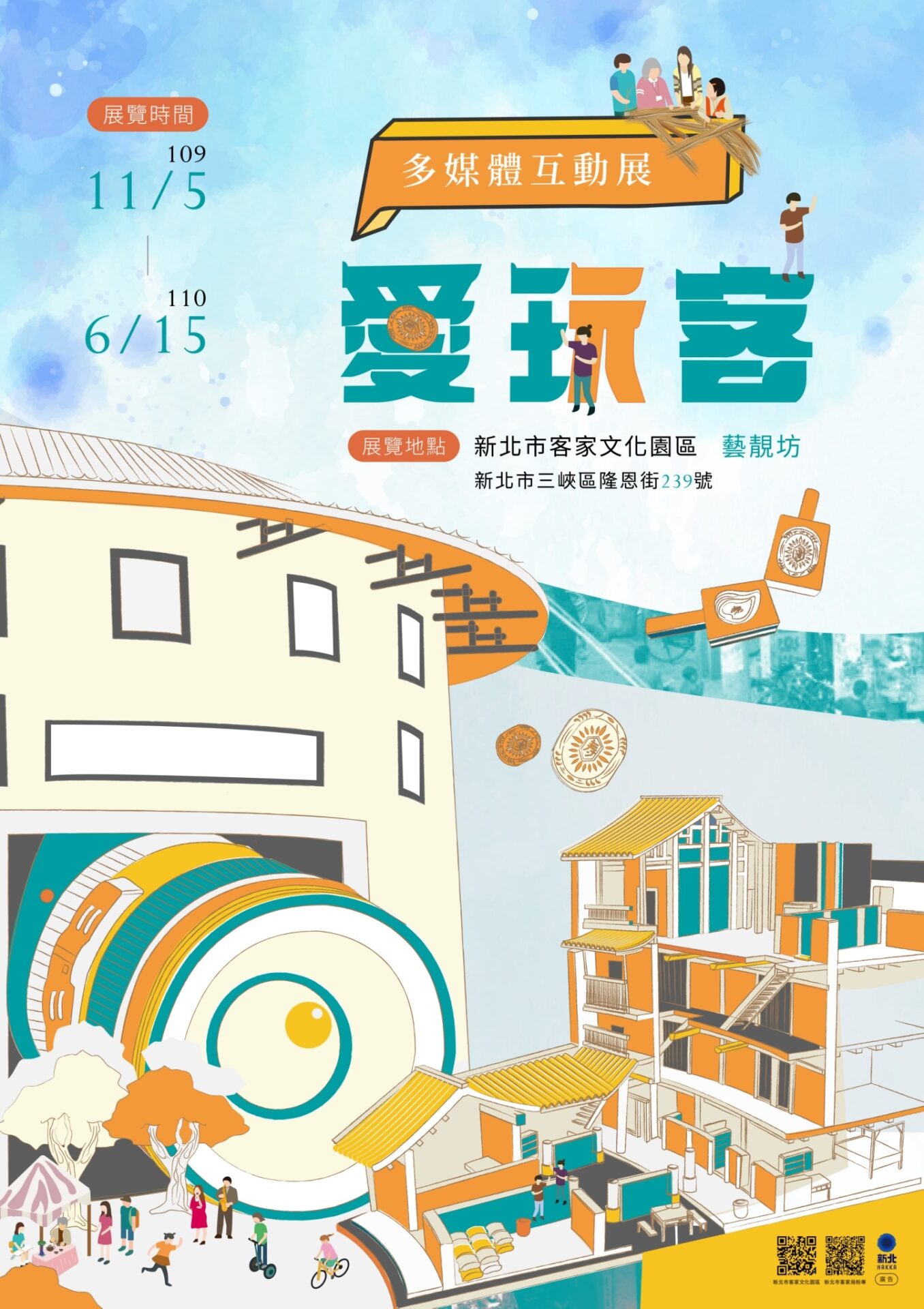 愛玩客─多媒體互動展規劃文青插畫圖文展示─「新北哈客行」、火車車廂情境造景─「戀戀縱貫線」及擴增實境─「AR城市晃遊」三大分區,以互動性強、操作便捷以及融合新科技等嶄新展出形式,呈現新北客家人文風光與自然地景。引領民眾跟著哈克與柴寶,玩翻新北客家「心」景點。