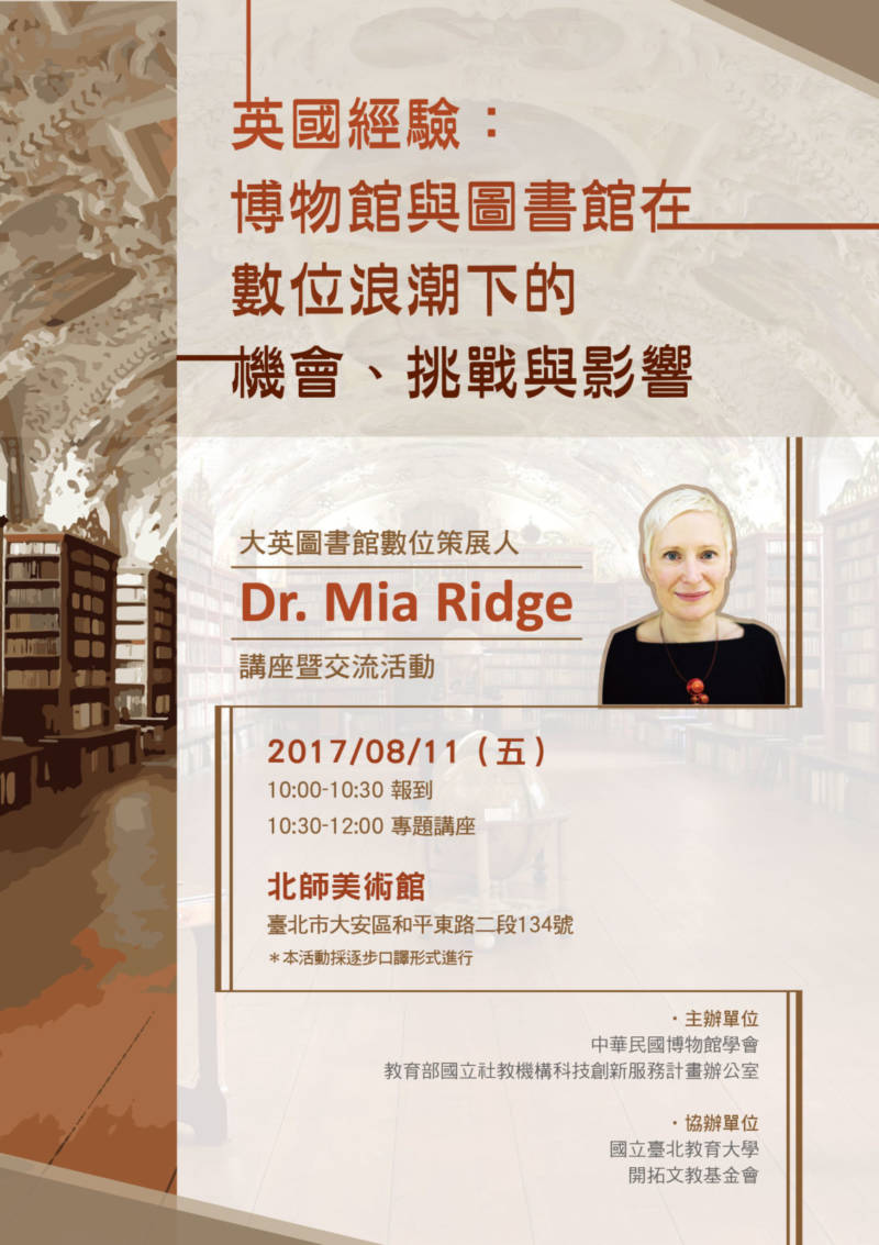 本次十分榮幸可以邀請到Dr. Mia Ridge來分享她在圖書館與博物館在數位時代下,應用群眾外包的經驗,共同切磋並交流經驗!名額有限,報名從速!